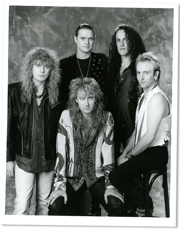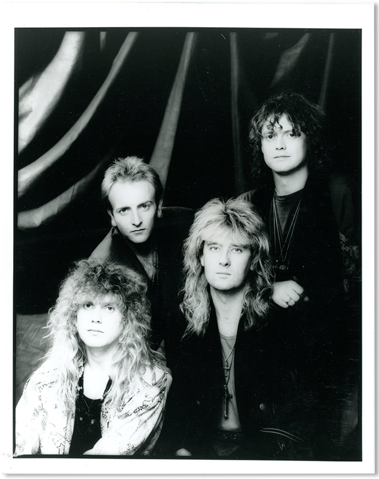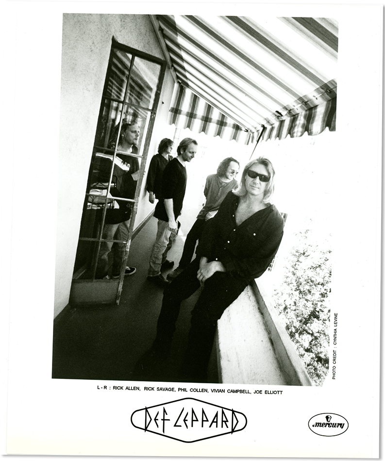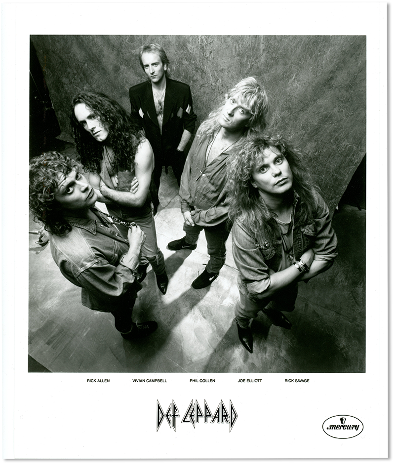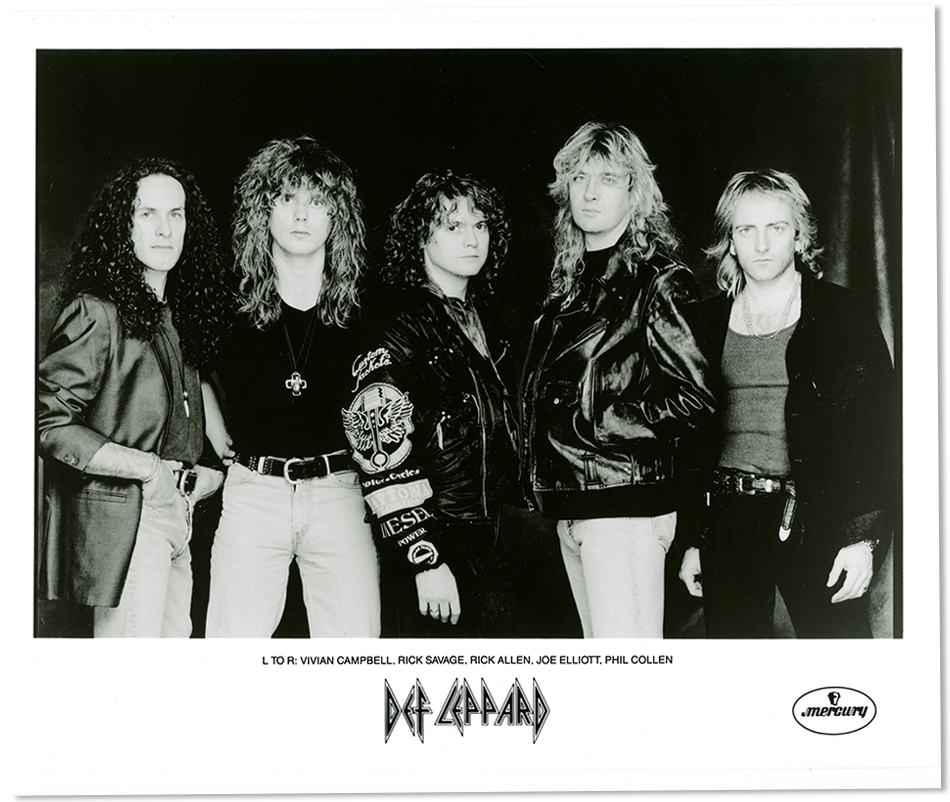 1992 black and white promotional photo of Def Leppard for Mercury Records. Joe Elliott, Phil Collen, Rick Savage, Vivian Campbell, Rick Allen. From the collection of Def Leppard.