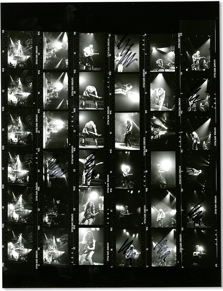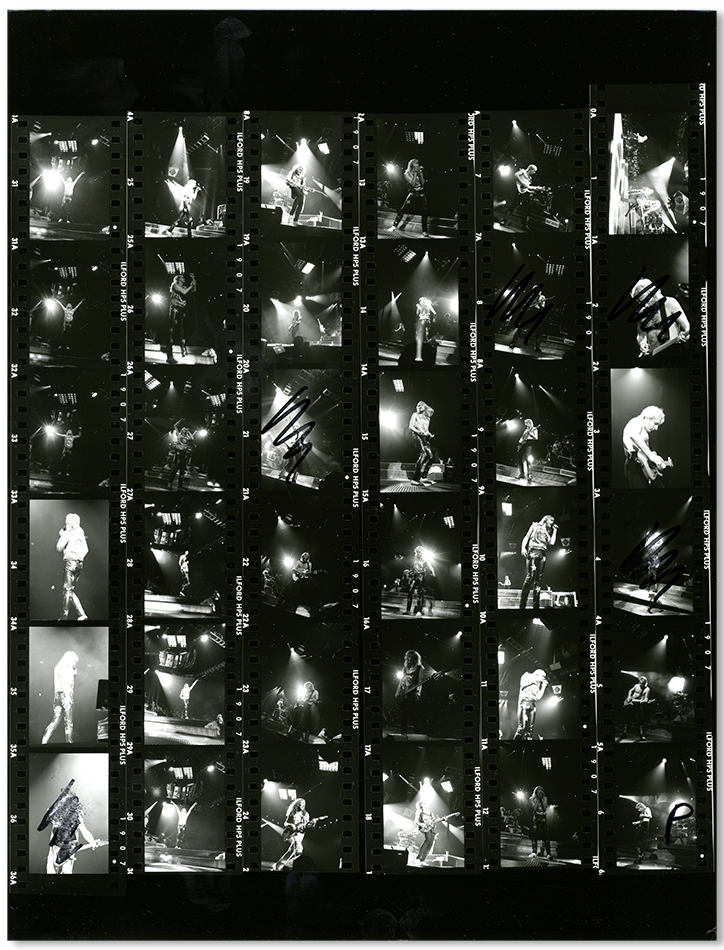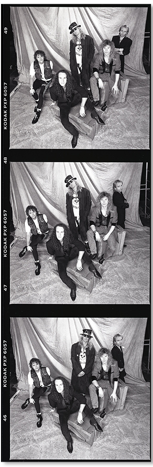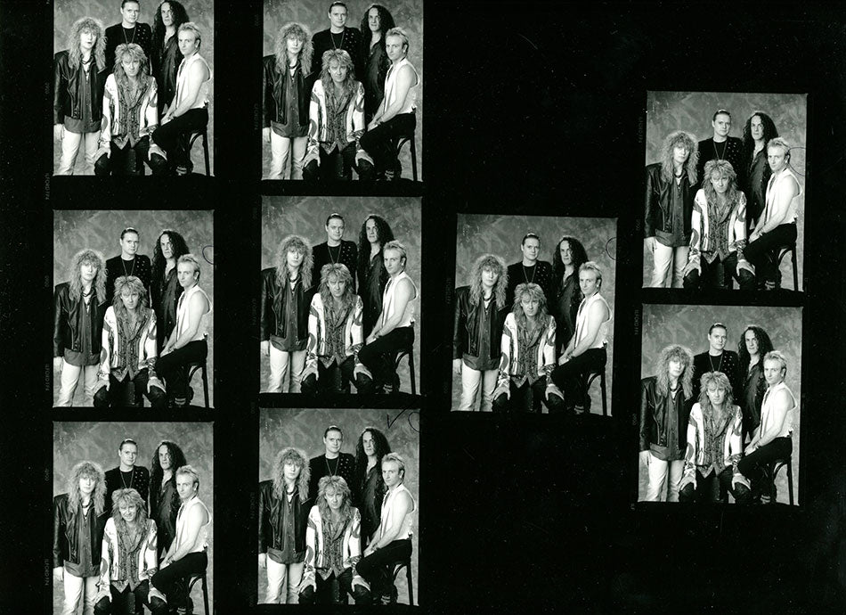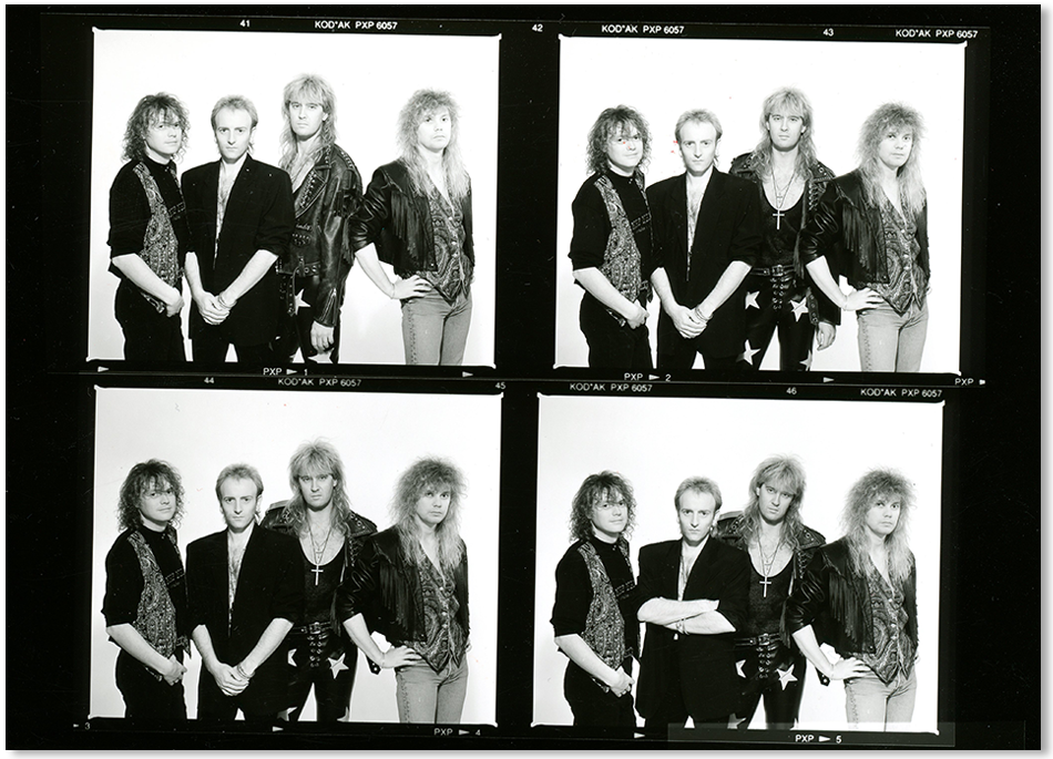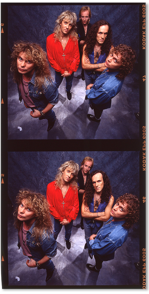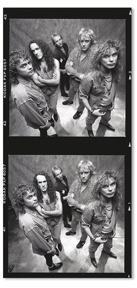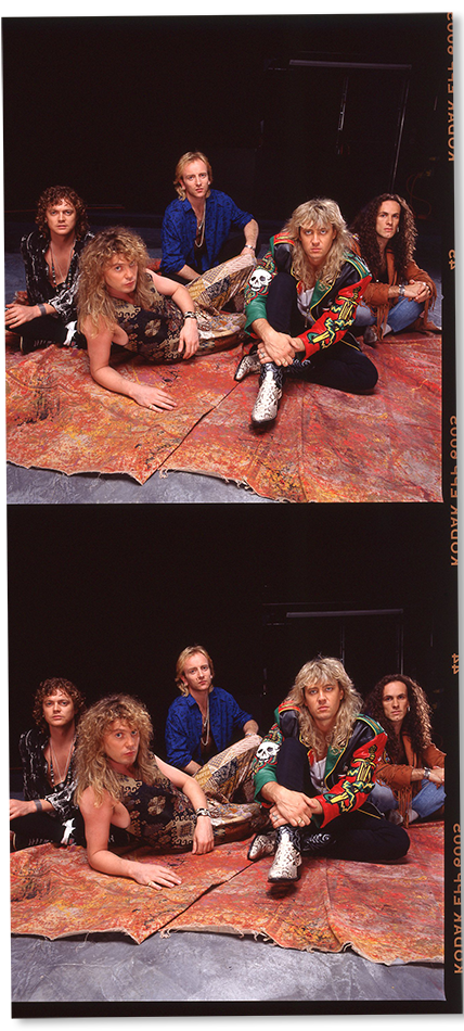 Color negative strip of Joe Elliott, Phil Collen, Rick Allen, Rick Savage, and Vivian Campbell from 1992. From the collection of Def Leppard.