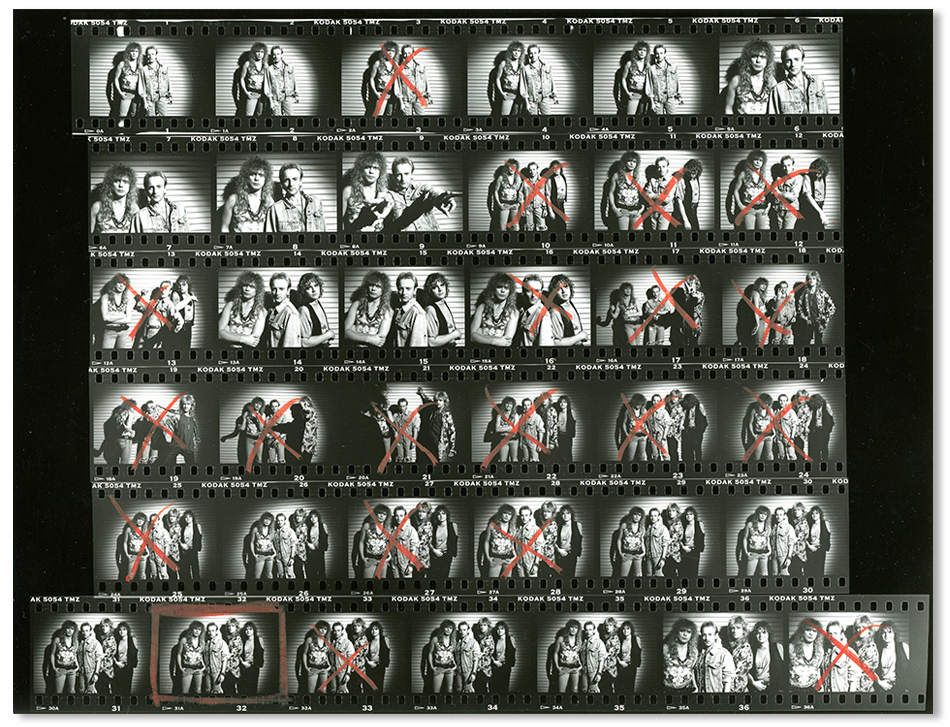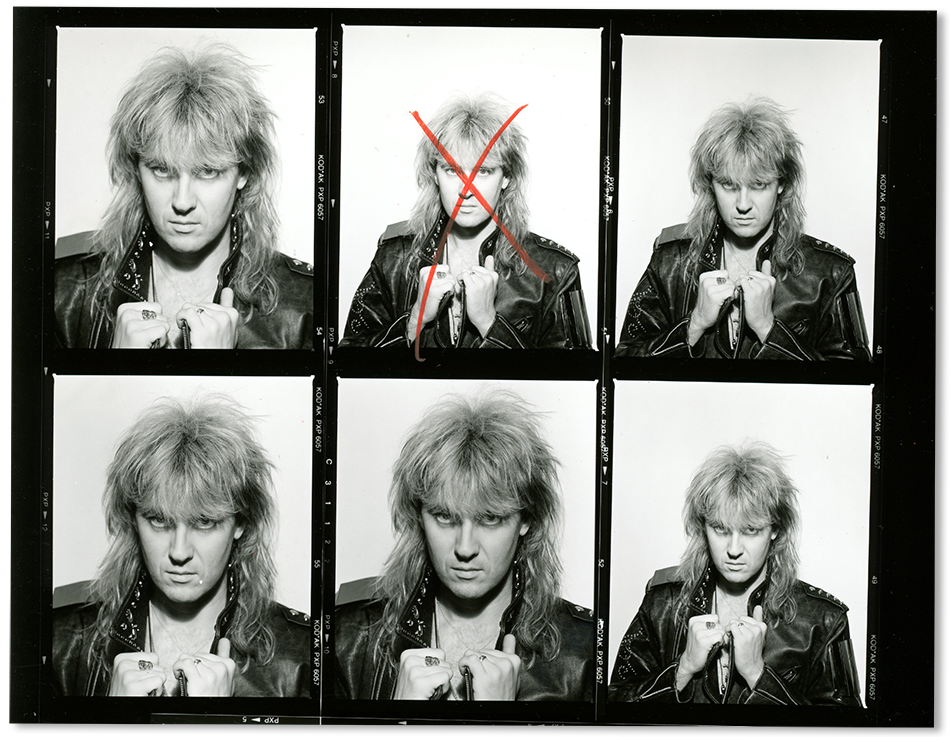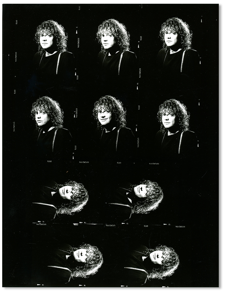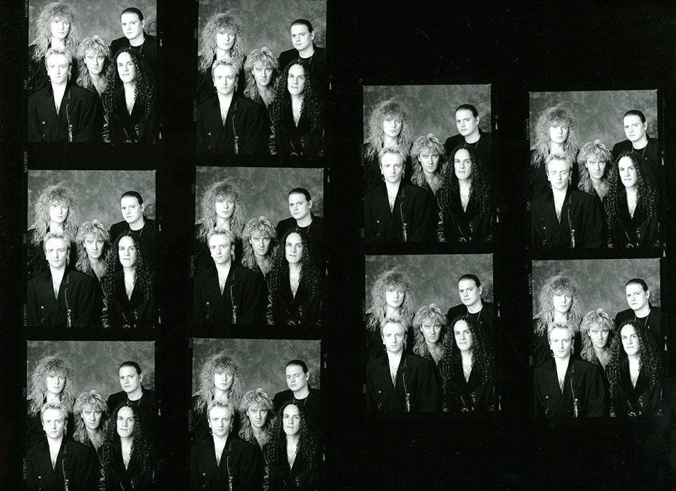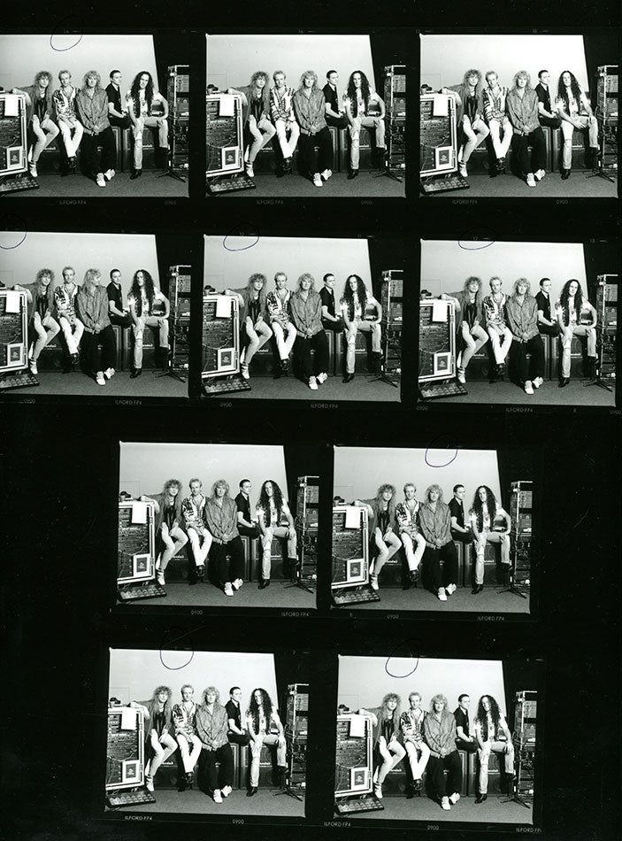 Black and white contact sheet from a 1992 shoot in Dublin with ten images featuring Joe Elliott, Phil Collen, Rick Savage, Vivian Campbell, and Rick Allen. Looks like the image on the top right didn't make the cut! From the collection of Def Leppard.