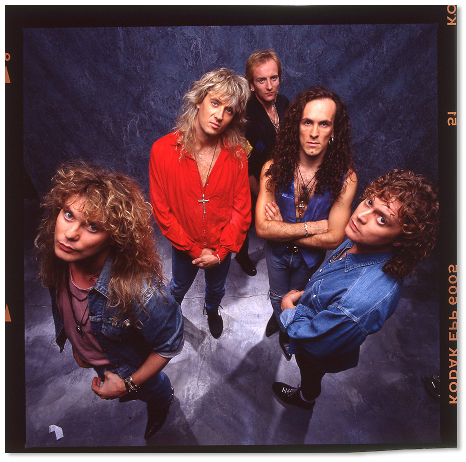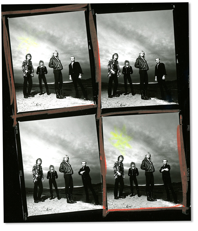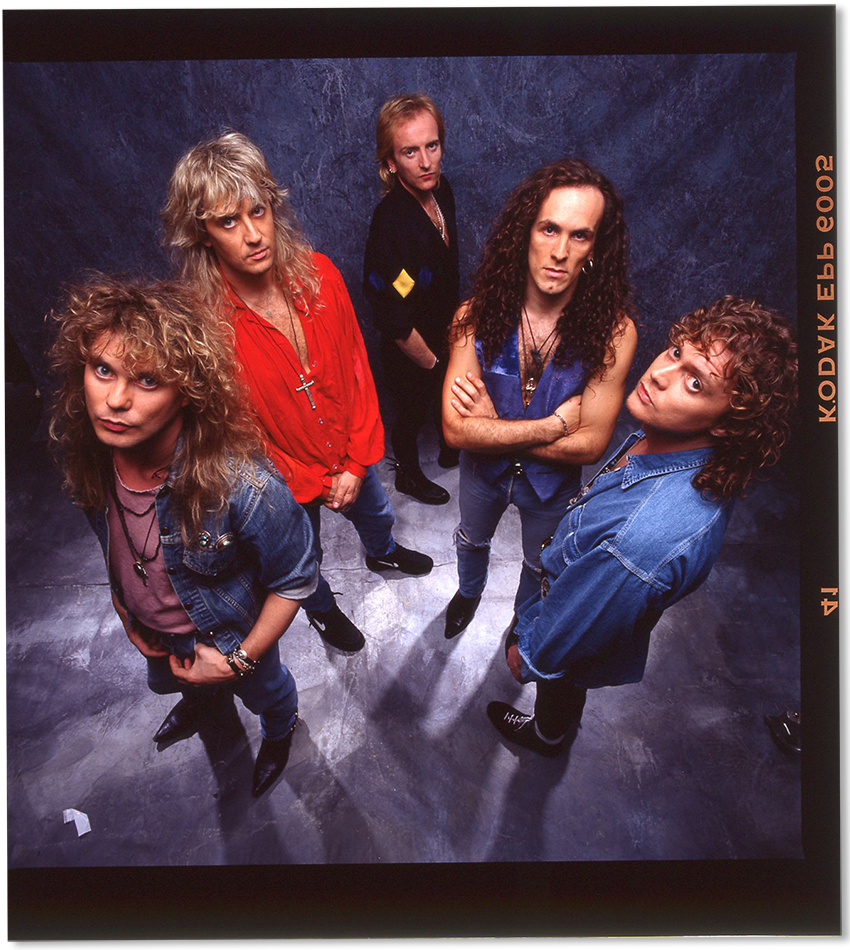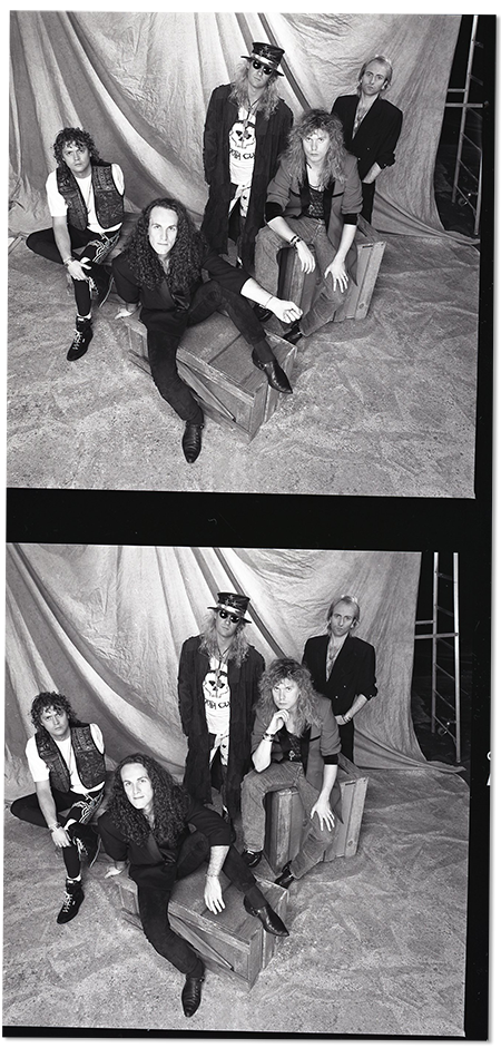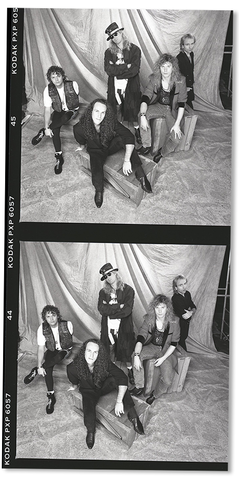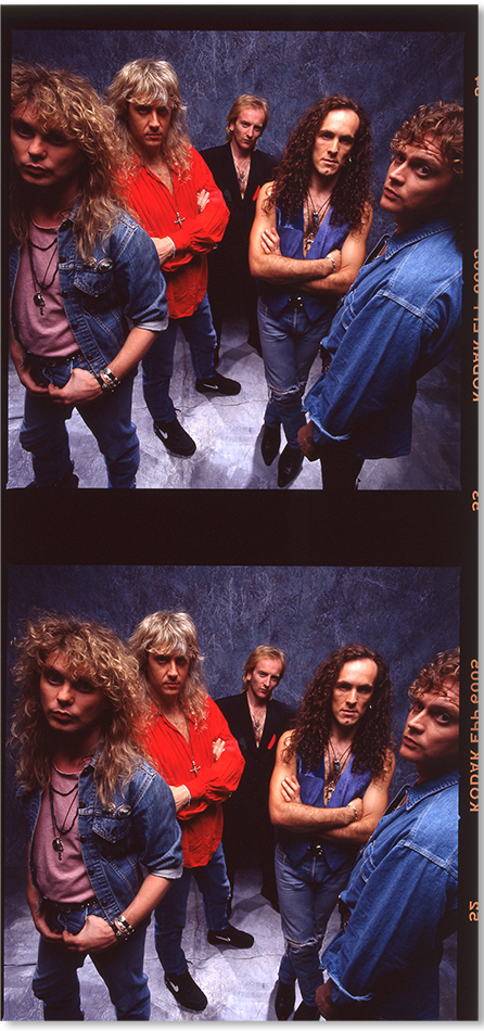 Color negative of Joe Elliott, Phil Collen, Rick Savage, Vivian Campbell, and Rick Allen from 1992. From the collection of Def Leppard.