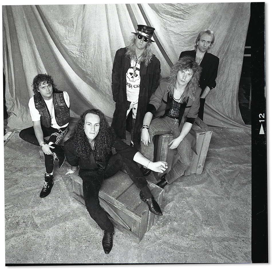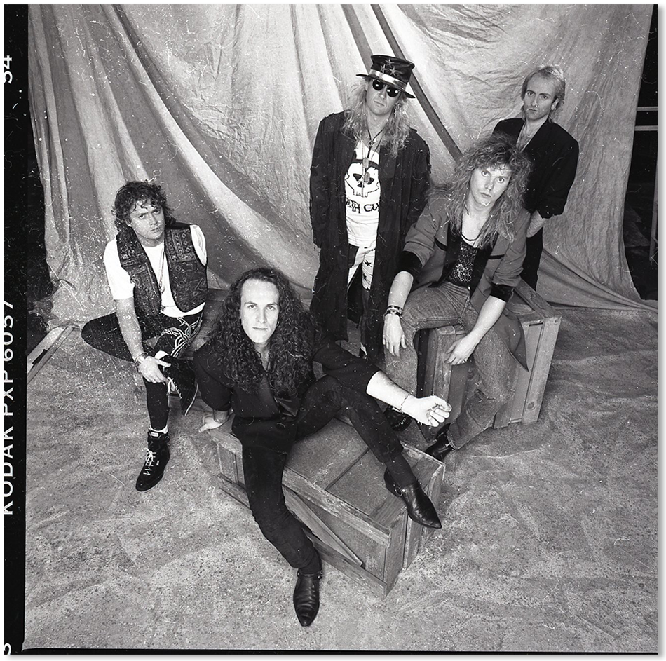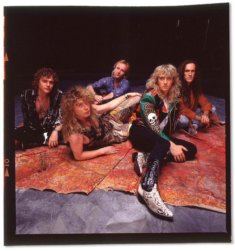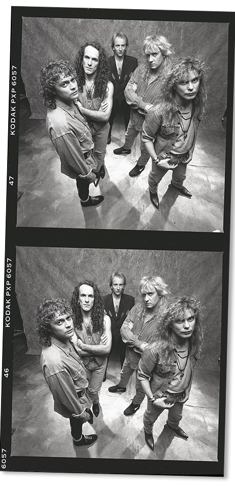 Color negative of Joe Elliott, Phil Collen, Rick Savage, Vivian Campbell, and Rick Allen from 1992. From the collection of Def Leppard.