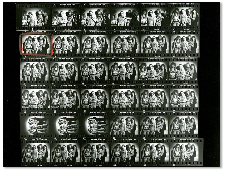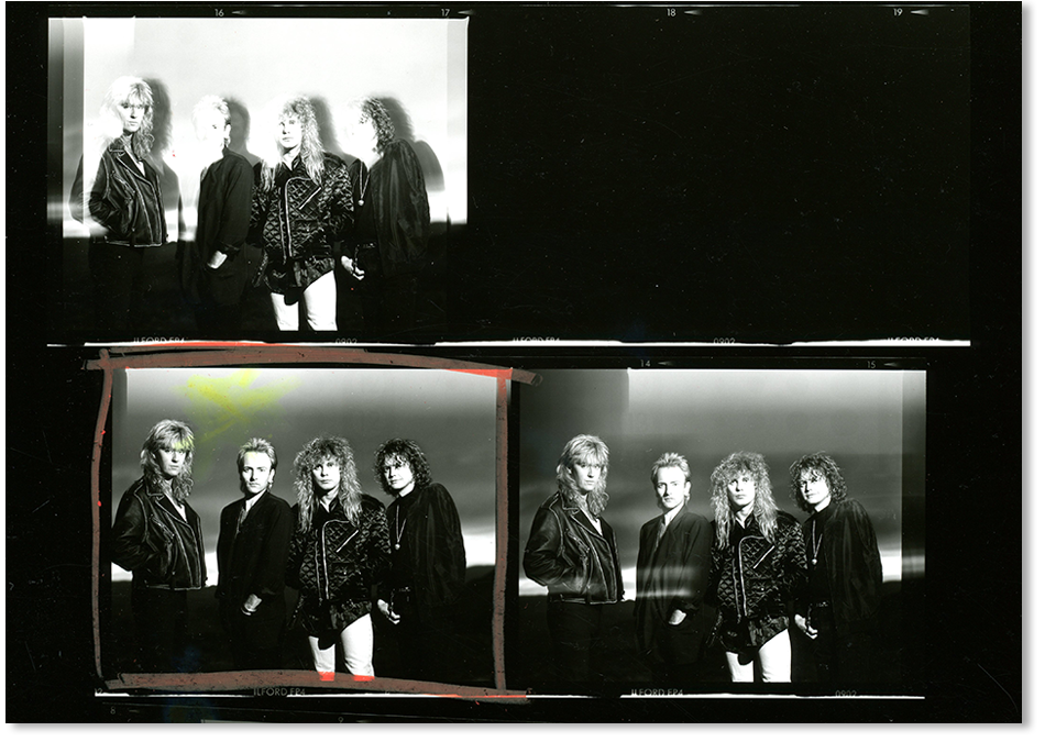 1992 shoot in Bray County Wicklow in Dublin for Rolling Stone Magazine. Black and white contact sheet of three images of Joe Elliott, Phil Collen, Rick Savage, and Rick Allen. The photographer is unknown. Selection notes are in red and yellow. From the collection of Def Leppard.