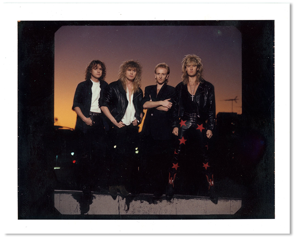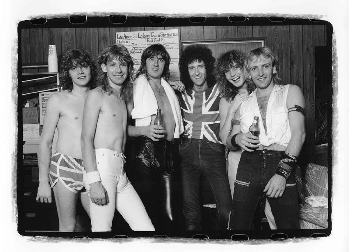 Post-show Pyromania elation backstage at the LA Forum, September 1983. Queen's Brian May was a special guest that evening and played along for the encore "Travelin' Band." It's always a good day when one of your rock heroes asks to jam. From the Collection of Def Leppard.