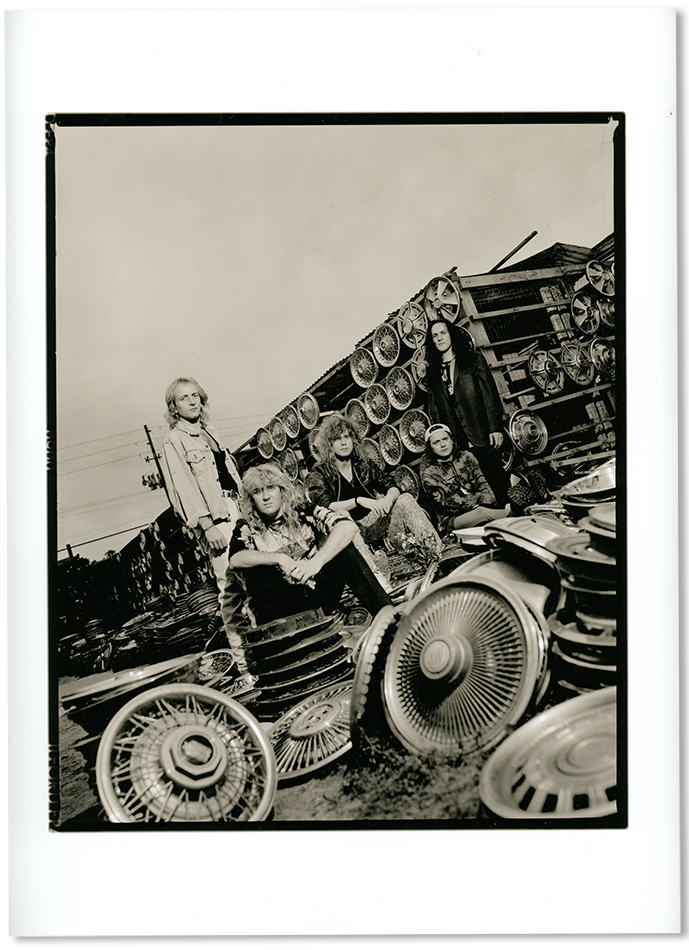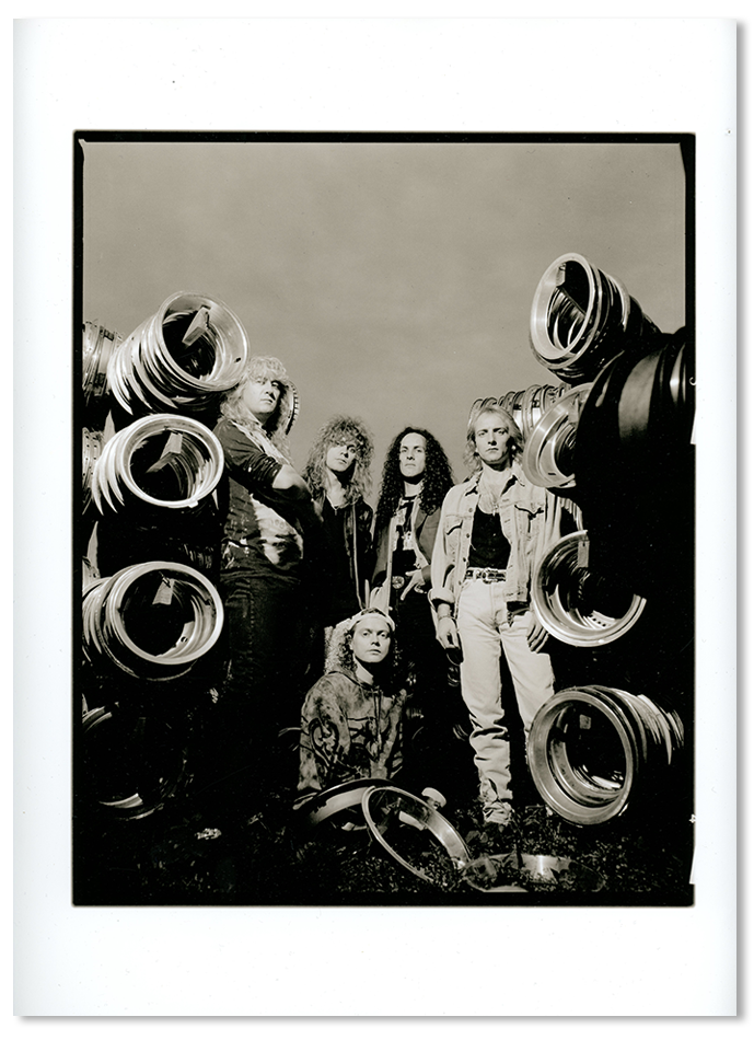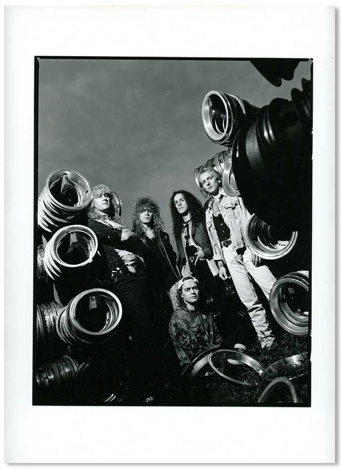 Black and white promotional photo shot somewhere in the Midwest 1992/93 featuring Joe Elliott, Phil Collen, Rick Savage, Vivian Campbell, and Rick Allen surrounded by tire rims. From the collection of Def Leppard.