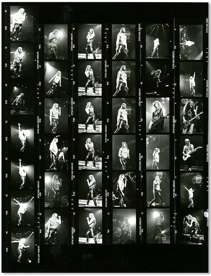 Black and white contact sheet of thirty six images of mostly Joe Elliott, Rick Allen, Rick Savage, Phil Collen, and Vivian Campbell rocking out on stage. The action shots were captured in 1992. From the collection of Def Leppard.