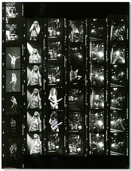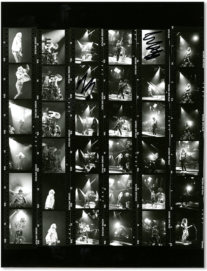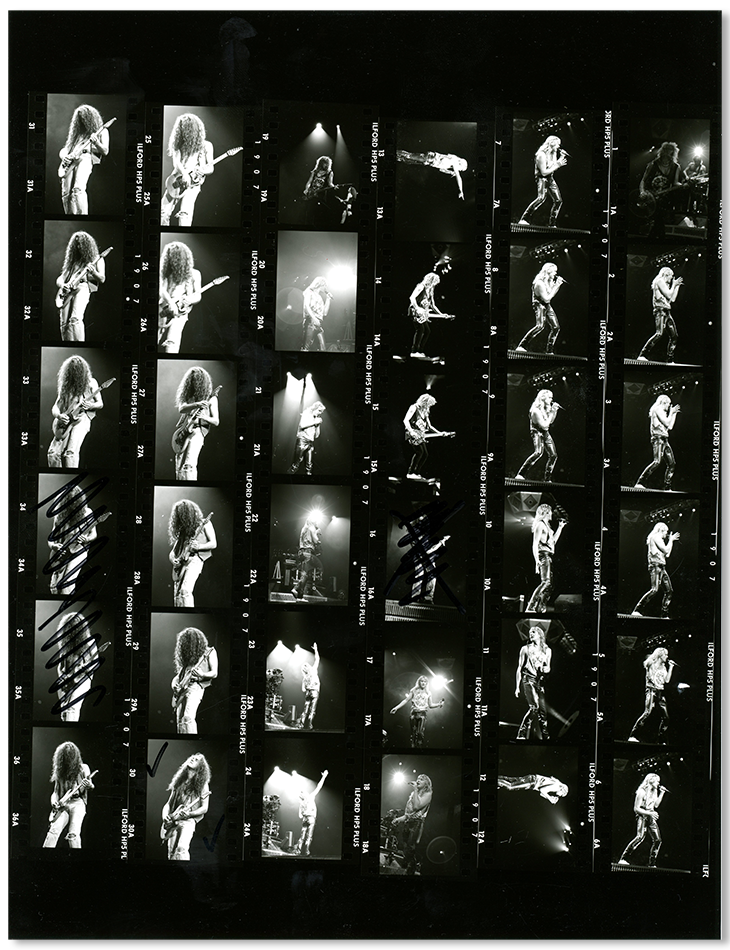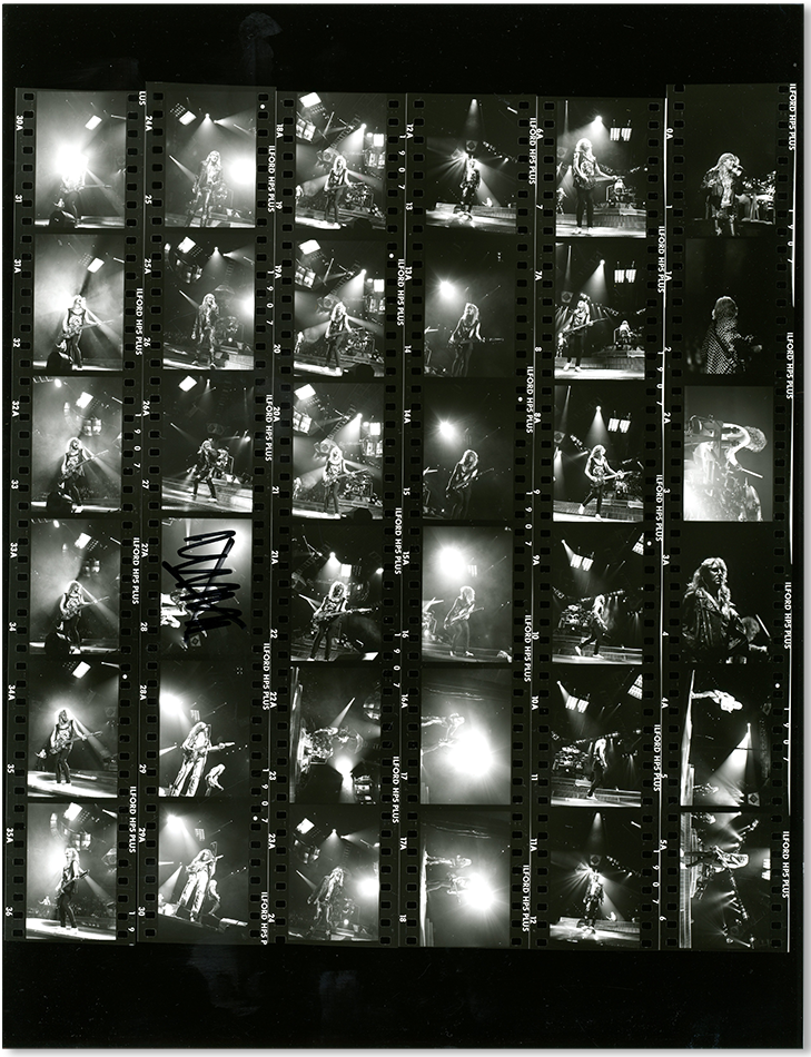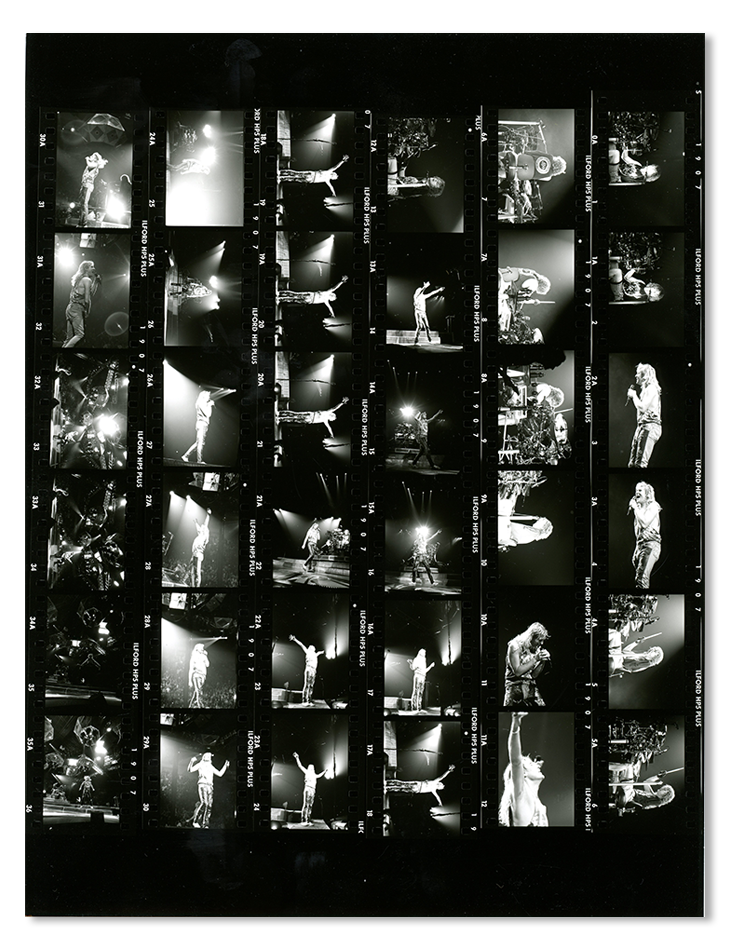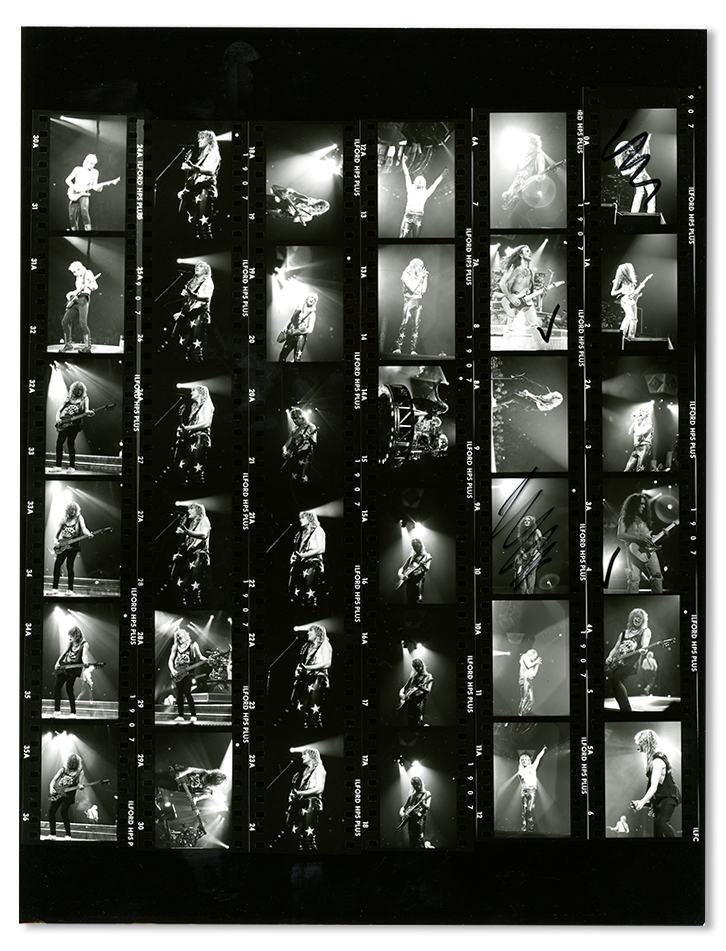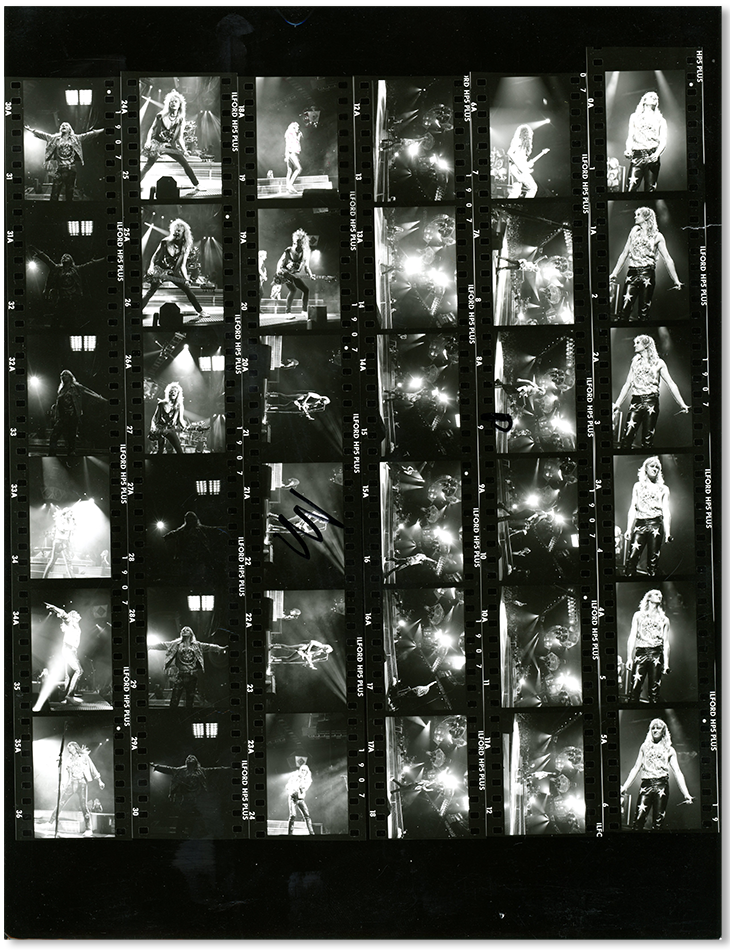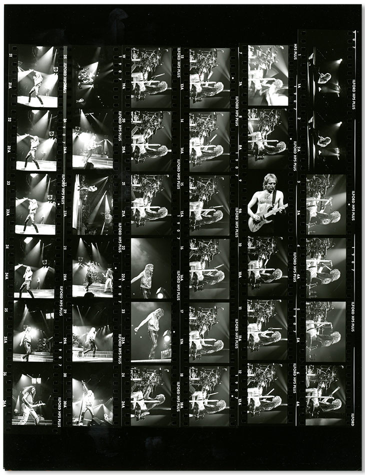 Black and white contact sheet of thirty seven images of mostly Joe Elliott rocking out on stage. If you look close, you can see cameo frames featuring Rick Savage, Phil Collen, and Vivian Campbell. The action shots were captured in 1992. From the collection of Def Leppard.