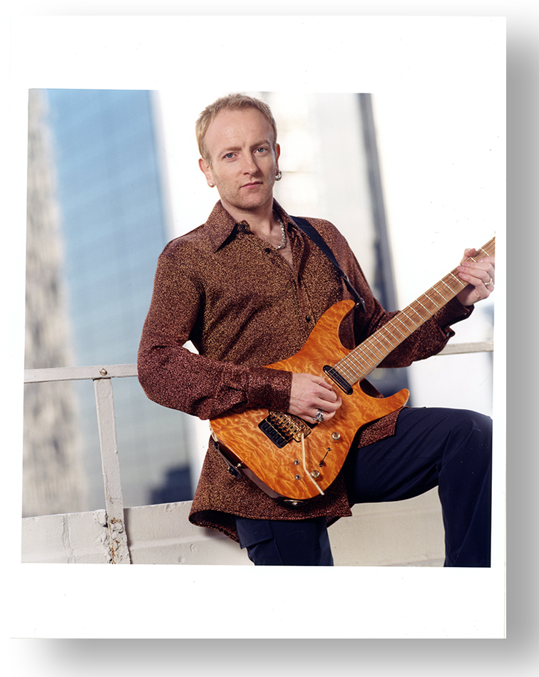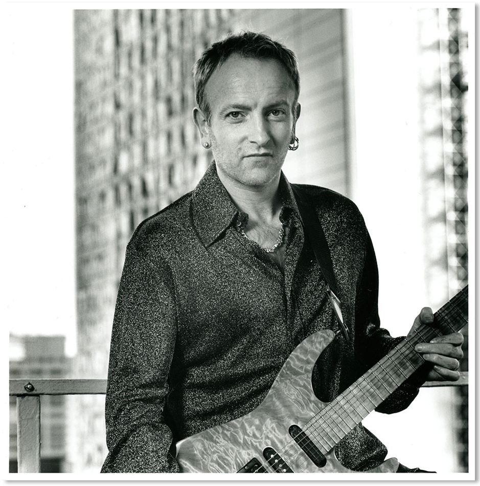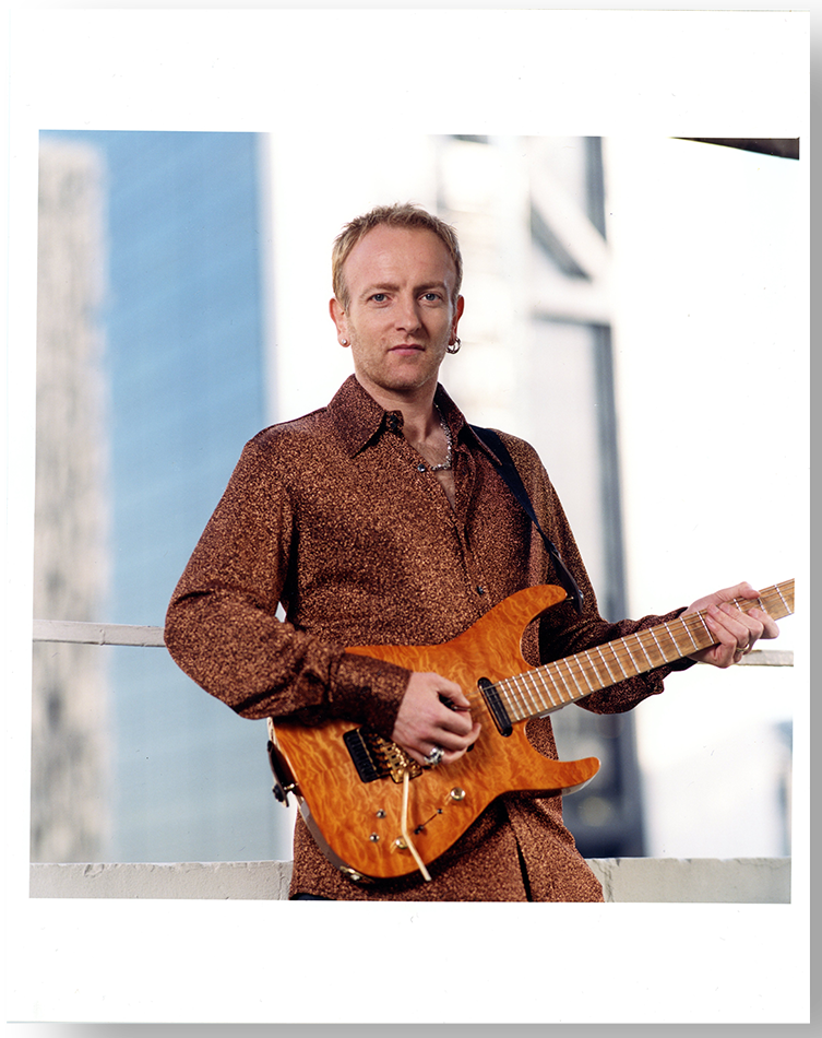 Euphoria album shoot 1999. Color promotional portrait of Phil Collen holding a guitar. From the collection of Def Leppard.