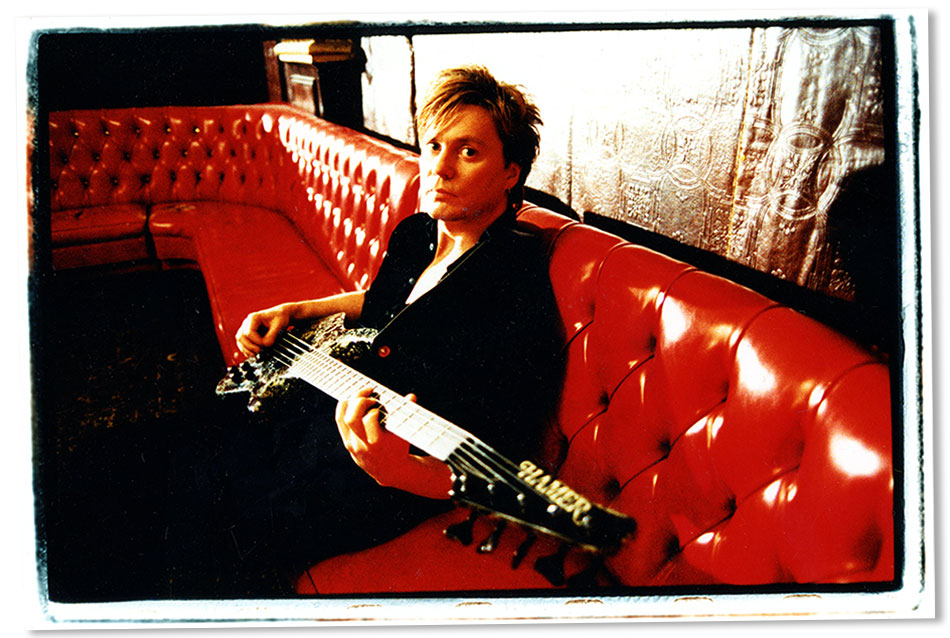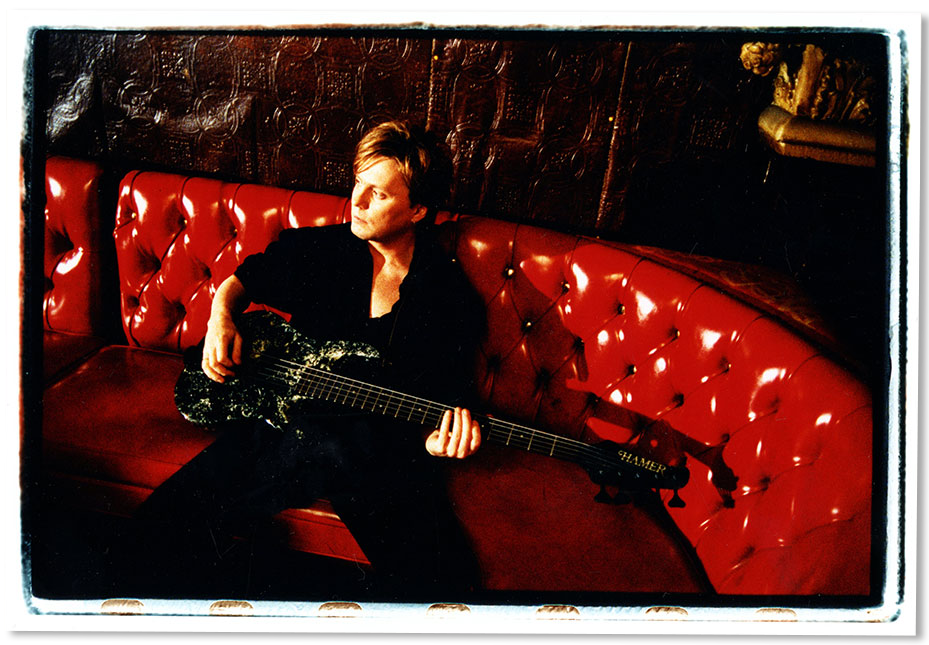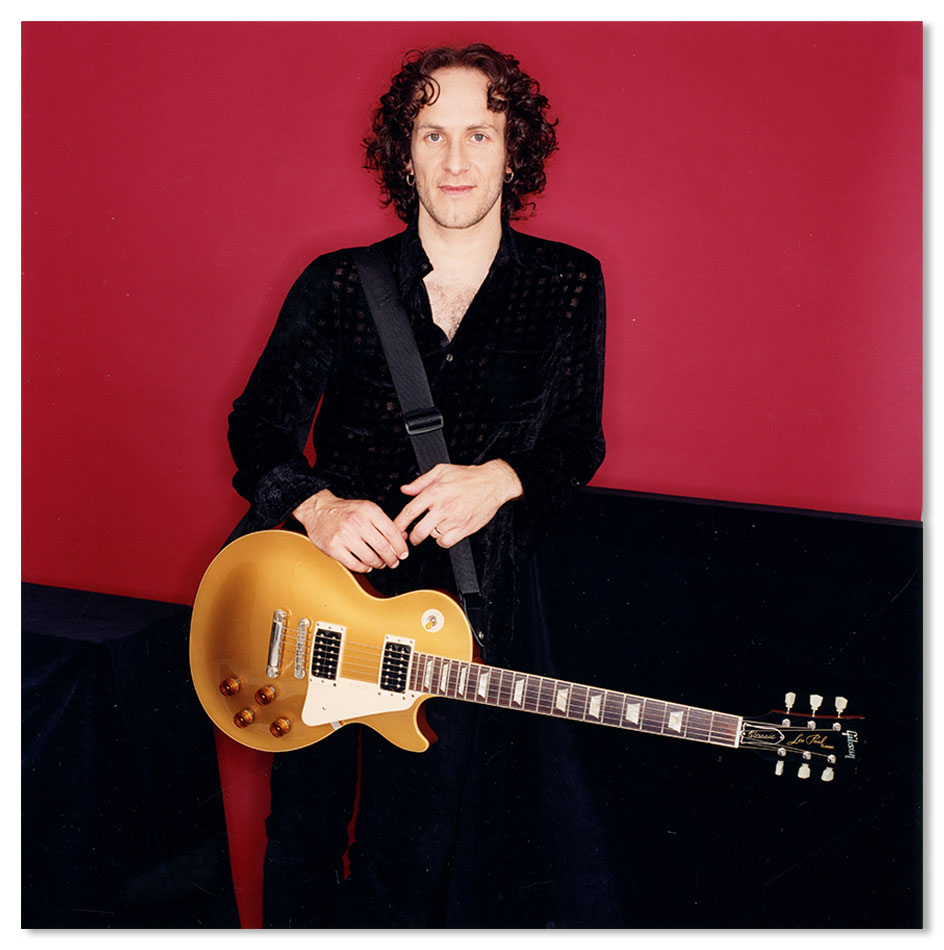 Euphoria album shoot 1999. Color promotional portrait of Vivian Campbell holding a guitar. From the collection of Def Leppard.