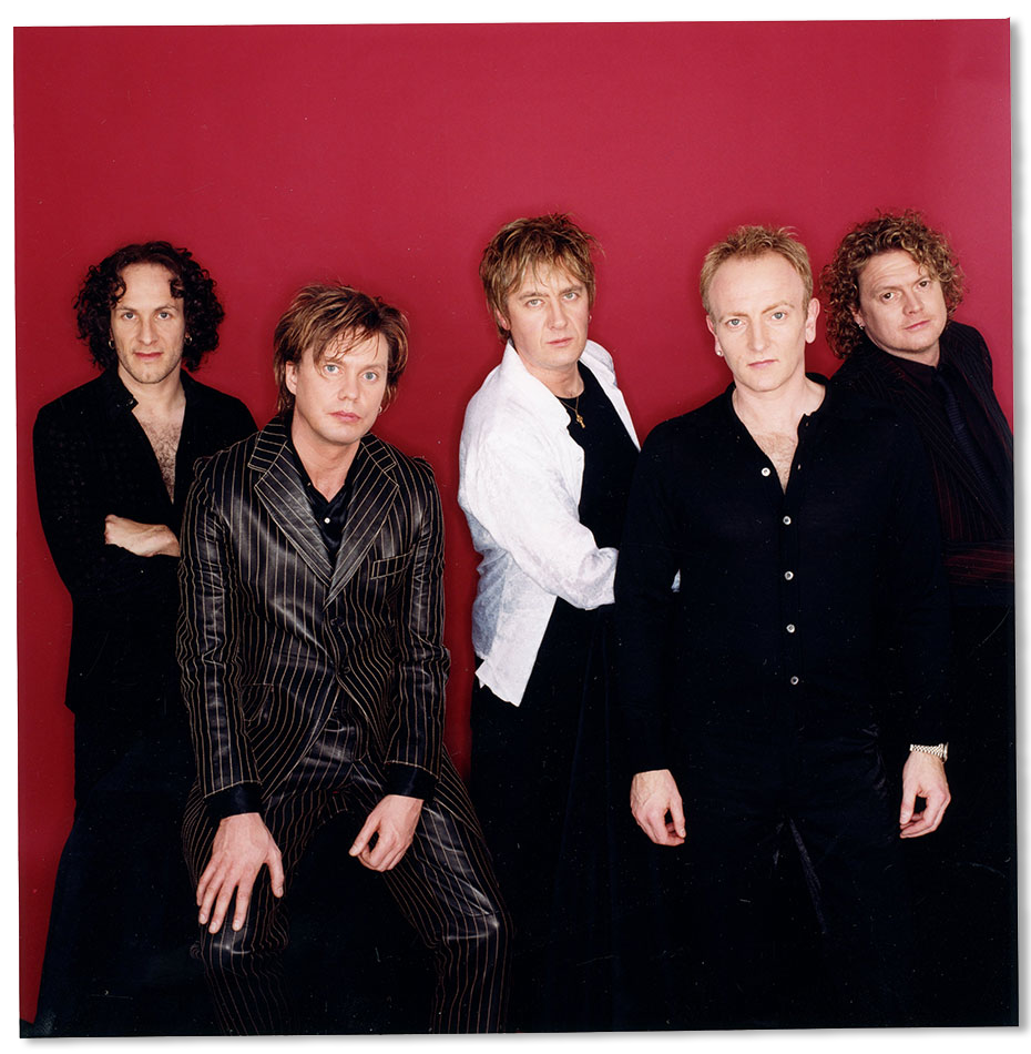 Euphoria album shoot 1999. Color promotional photo featuring Joe Elliott, Phil Collen, Rick Savage, Vivian Campbell, and Rick Allen standing in front of a red background. From the collection of Def Leppard.