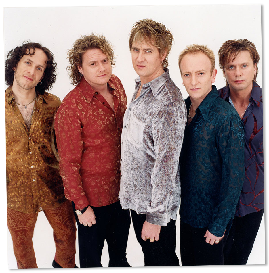 Euphoria album shoot 1999. Color promotional photo featuring Joe Elliott, Phil Collen, Rick Savage, Vivian Campbell, and Rick Allen standing in front of a white background. From the collection of Def Leppard.