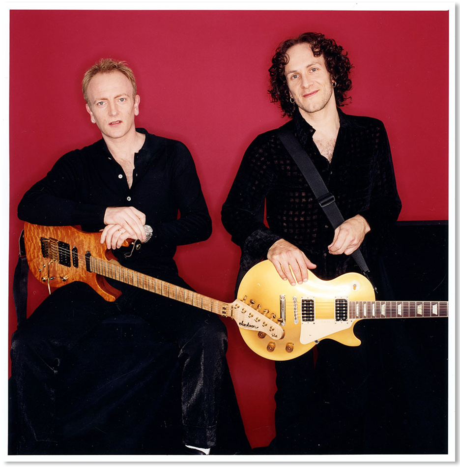 Euphoria album shoot 1999. Color promotional portrait of Phil Collen and Vivian Campbell holding guitars. From the collection of Def Leppard.