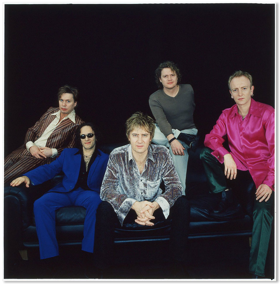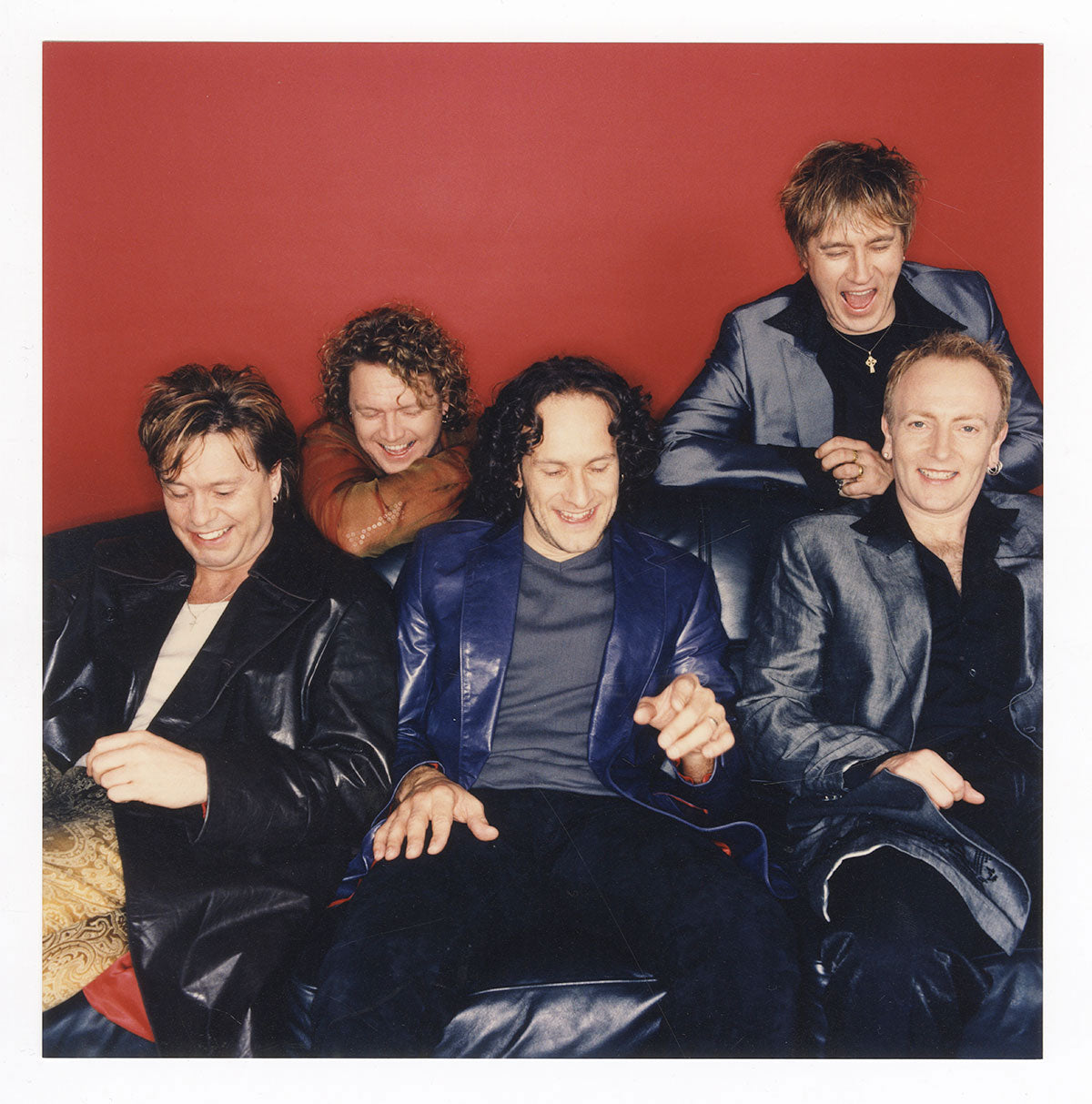 Euphoria album shoot 1999. Color negative of Joe Elliott, Rick Allen, Rick Savage, Vivian Campbell, and Phil Collen lounging on a couch against a black backdrop. From the collection of Def Leppard.
