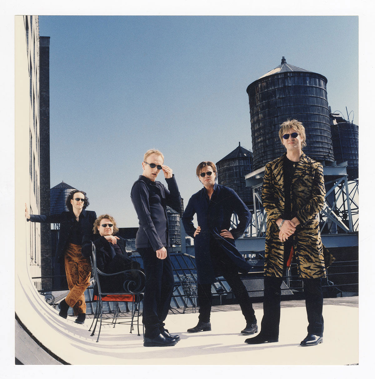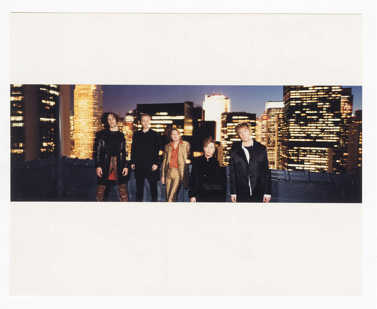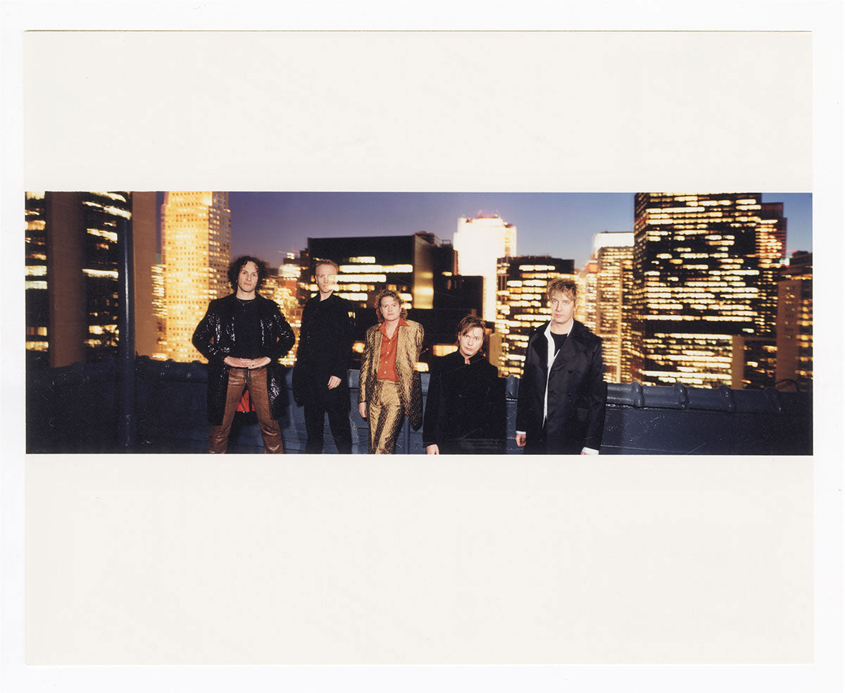 Gorgeous, 8x10 colour portrait of the band taken during a session for Euphoria album insert artwork, circa 1999. Vivian Campbell, Phil Collen, Rick Allen, Rick Savage, and Joe Elliott stand on a rooftop with the city skyline behind them. A handwritten note on the back reads, "300091 3/4/5 artwork." Housed in Q Prime envelope labeled "Album artwork." From the collection of Def Leppard.