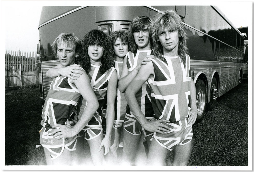 Classic Leppard. Phil Collen, Rick Savage, Rick Allen, Joe Elliott, and Steve Clark stand in front of their tour bus, all suited up in Union Jack tees and shorts - ready to set the world on fire for the Pyromania Tour, summer of 1983. Courtesy of the Lorelei Shellist Private Collection.