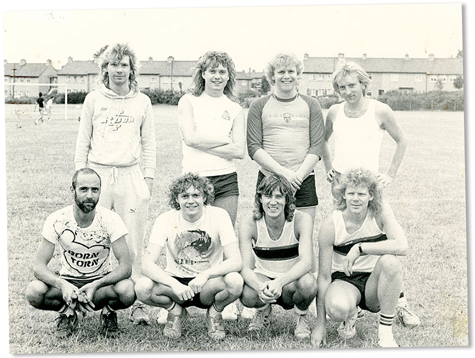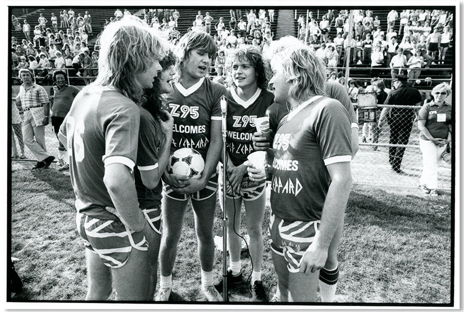Top Row: Steve Clark, Rick Savage, Robert Allen (Rick's brother), Phil Collen. Bottom Row: Mike Rogers (Phil's Guitar Tech), Rick Allen, Joe Elliott, and Mutt Lange (Producer) on Willesden Green in London for a game of football circa 1982. This field was just down the way from Battery Studios where Pyromania was being recorded. All the Leppards have a love for soccer and music, but the two dueled especially hard for Sav, as he explains here: "Now I was always interested in music, loved music, loved watching Top of the Pops as a 12-year old, moving on. I got an interest in playing guitar through my elder brothers. I'm the younger of three sons. I'm seven years adrift of the other two. So I always had elder brothers. My father was a semiprofessional pianist that would on the weekends would play in clubs and bars and stuff. So by the age of, I think it was 10 years old, I learned to play "Maggie May" by Rod Stewart on the acoustic guitar - picked it up really quickly. From then on, I just really wanted to learn to play, and thus wanted to improve. So there was a point in time where I was learning my guitar and actually playing football, but the real - it was almost a sliding doors moment where within a period of three weeks, it became obvious. Well, Sheffield United had turned around and said that they didn't think I was going to be quite good enough to become a professional. I had lots of offers from other clubs. I kind of was losing my love of the game at the time. And within this very short time period, I met up with Joe for the first time. And almost overnight went from being budding as a soccer player to budding Rock God. (laughs) So it was like Joe in a sense, in many ways, saved my life. 'Cause I don't know what else I would have done. I'd just been working for British Rail, the train company in the UK at the time. It literally went from one focus of being a soccer player to this other focus of like, geez, I'm in a band. And I think this band could be really, really good. So it was like almost an overnight process. Courtesy of the Lorelei Shellist Private Collection.