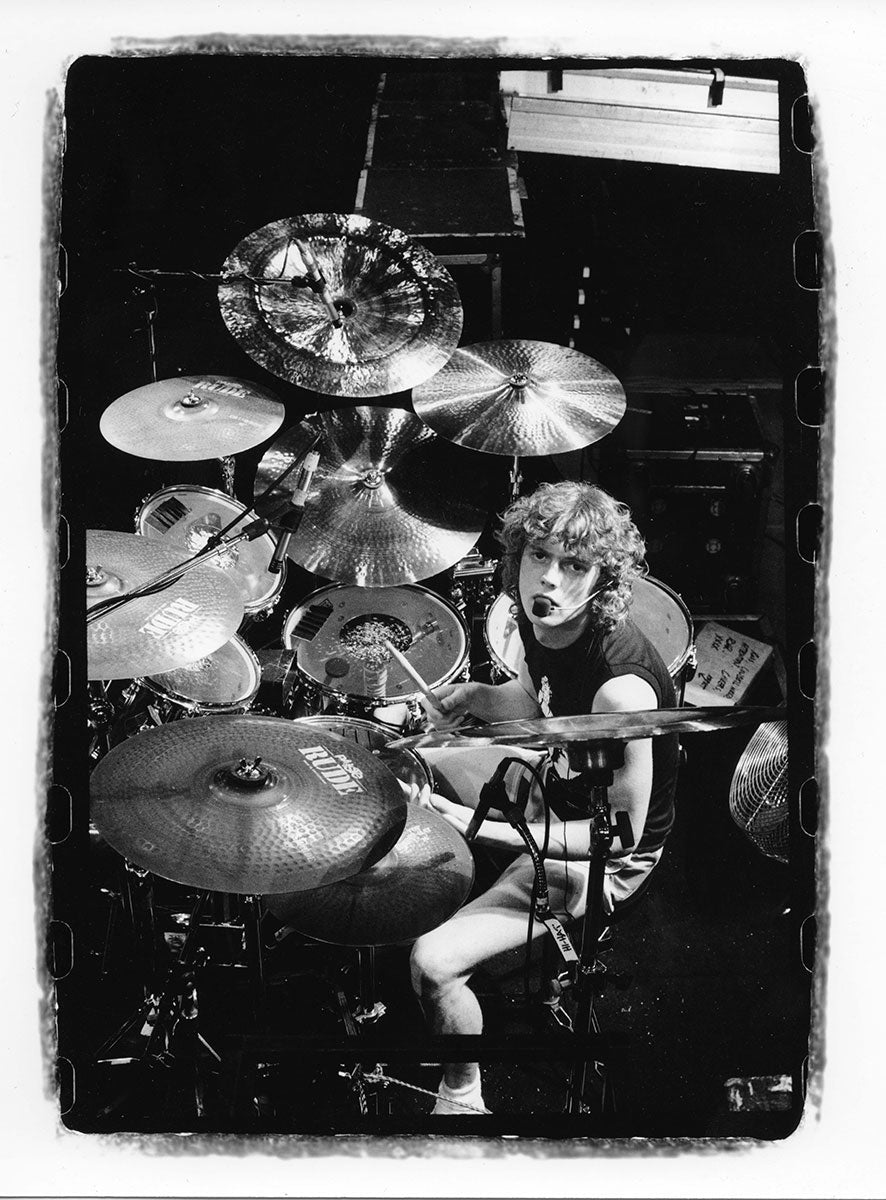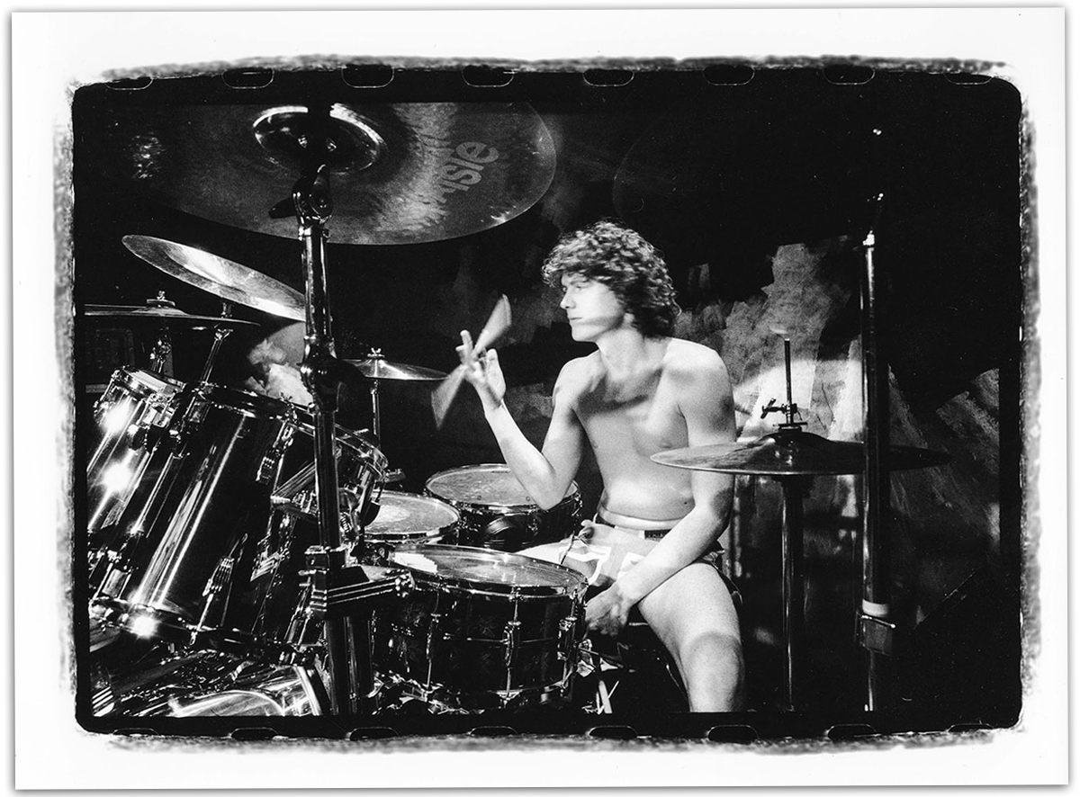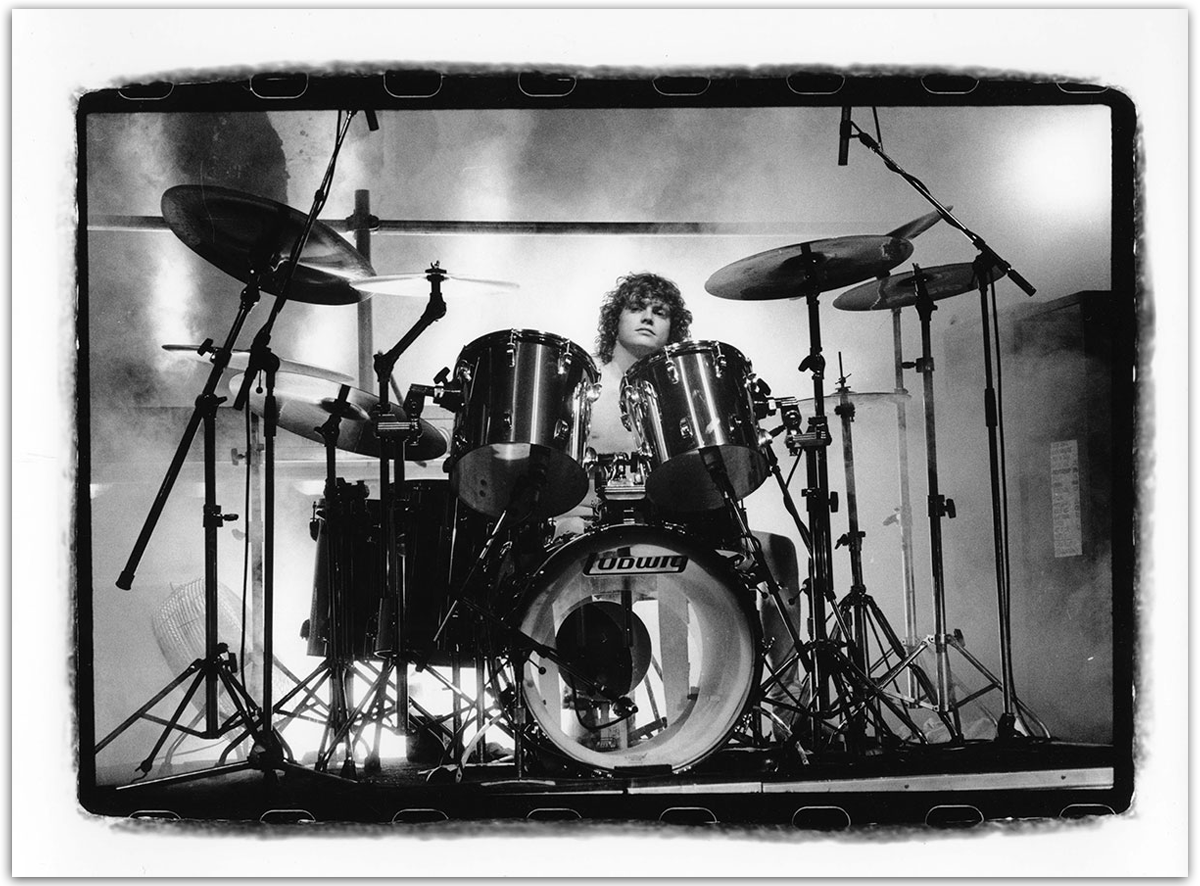 Rick sitting behind an impressive drum kit, wearing a wireless headset mic and ready to rock a Pyromania performance, circa 1983/1984. There's a note behind him, requesting cowbell. From the Collection of Def Leppard.