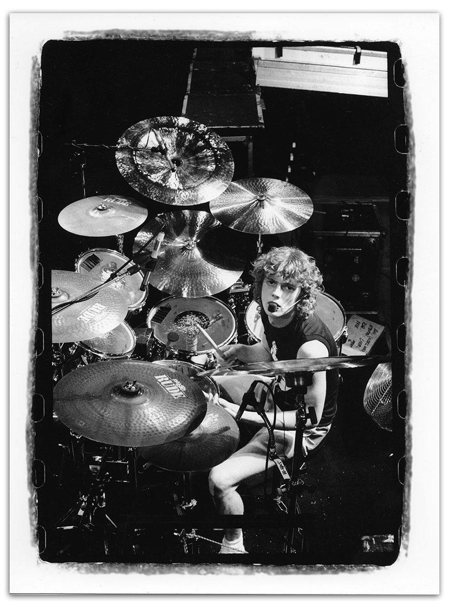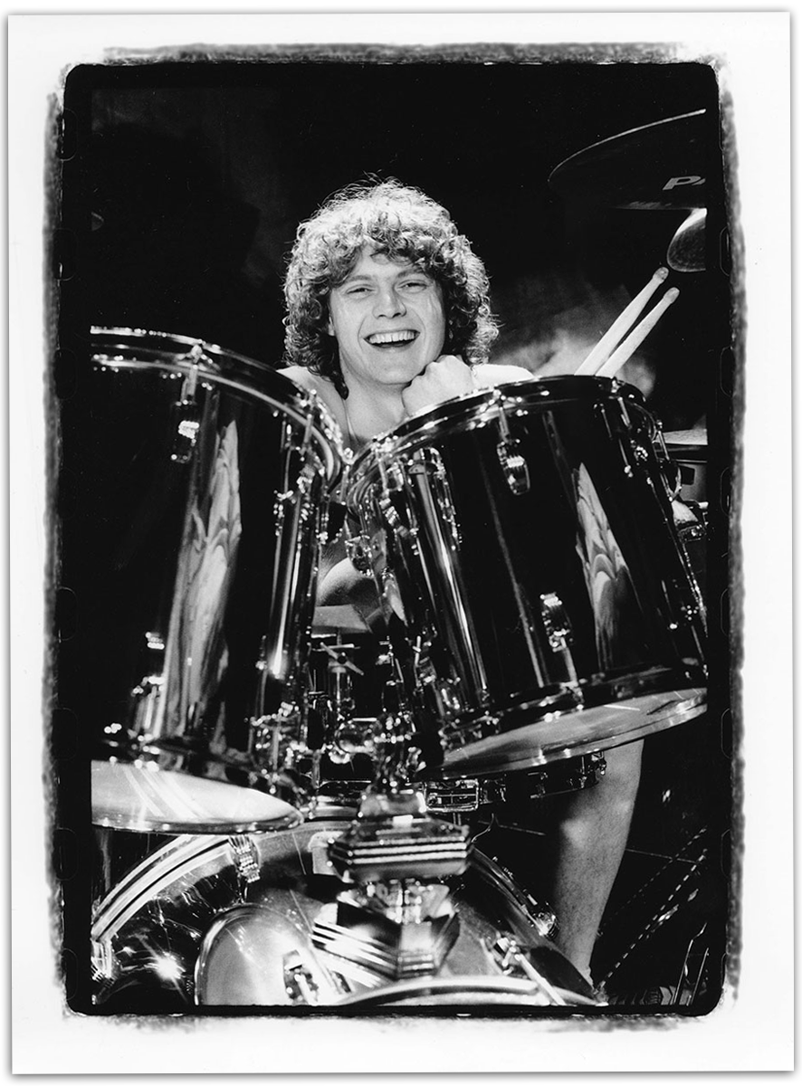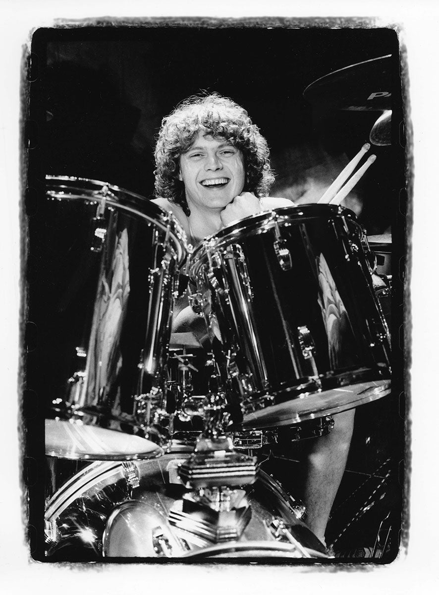 Rick sitting behind an impressive drum kit, wearing a wireless headset mic and ready to rock a Pyromania performance, circa 1983/1984. There's a note behind him, requesting cowbell. From the Collection of Def Leppard.
