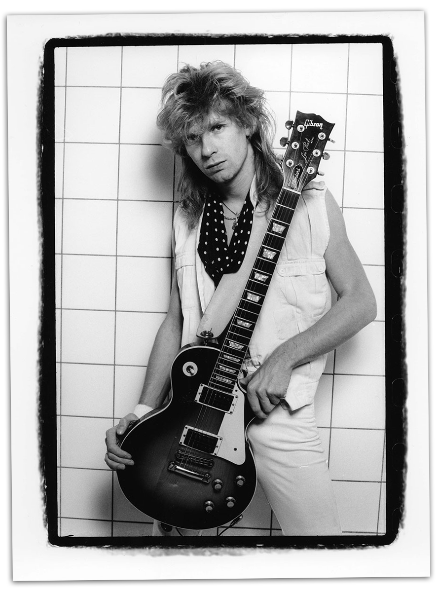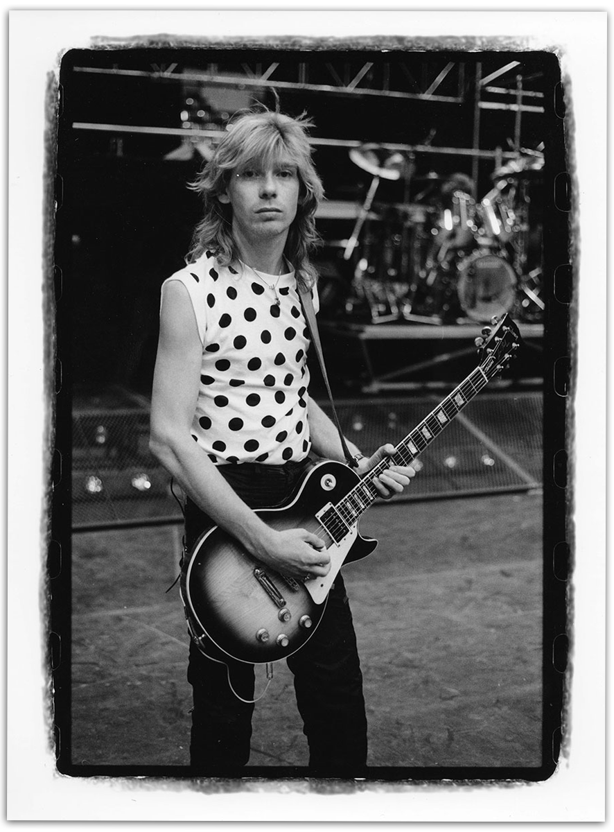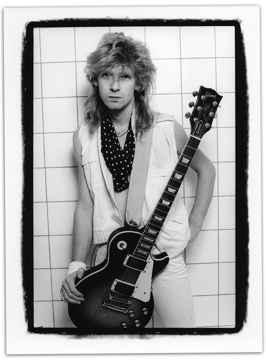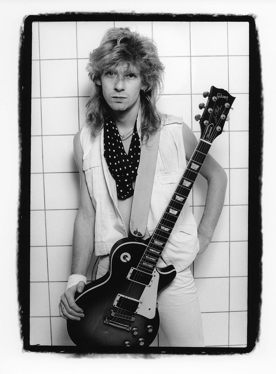 Steve wears a much beloved Gibson Les Paul in front of a tiled wall. This photo was snapped offstage during the 1983 Pyromania Tour. From the Collection of Def Leppard.
