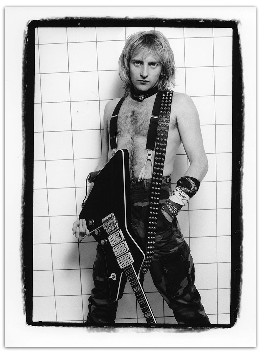 Phil strikes a pose in front of a tiled wall, no doubt preparing to do some damage with his Ibanez Destroyer. This photo was snapped offstage during the 1983 Pyromania Tour. From the Collection of Def Leppard.