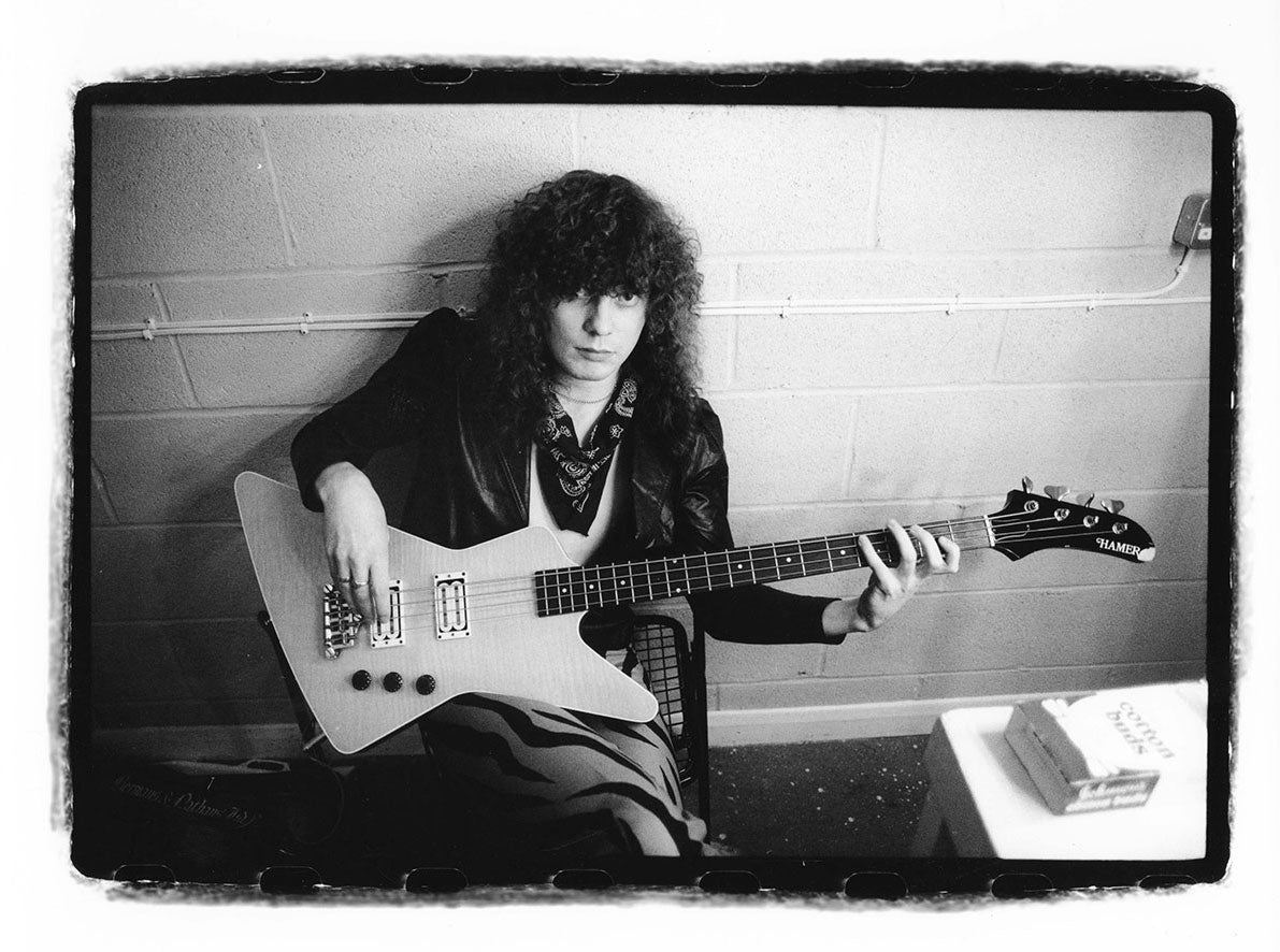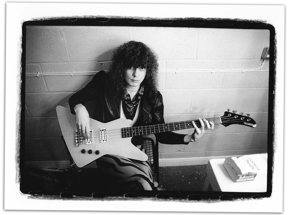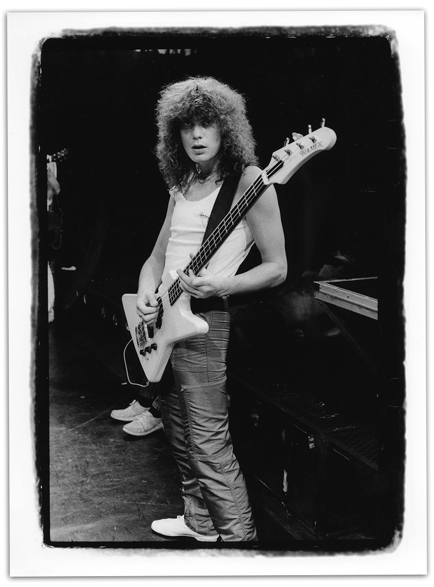 Sav warming up on the Hamer Blitz before a show on the Pyromania tour, circa 1983. From the Collection of Def Leppard.
