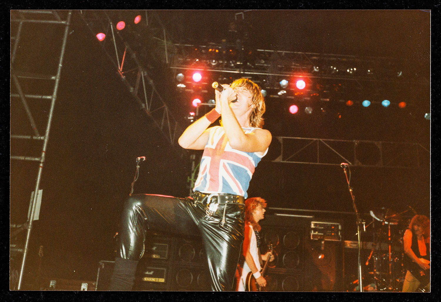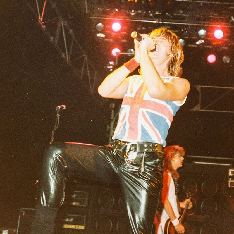 Joe Elliott performs on the Pyromania Tour, circa 1983. Joe said of this classic outfit, "Pleather trousers - £10, handcuff belt - £7, Union Jack shirt - £ 7.99; overall look, priceless!" From the Collection of Joe Elliott.