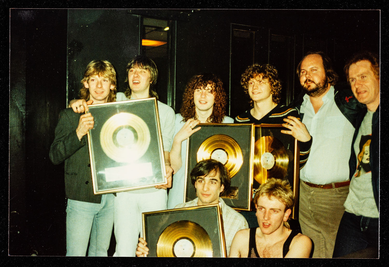 Steve, Joe, Sav, Rick and Phil hold gold RIAA awards for High 'n' Dry, December 1982. Band manager Peter Mensch is kneeling to Phil's right. From the Collection of Joe Elliott.