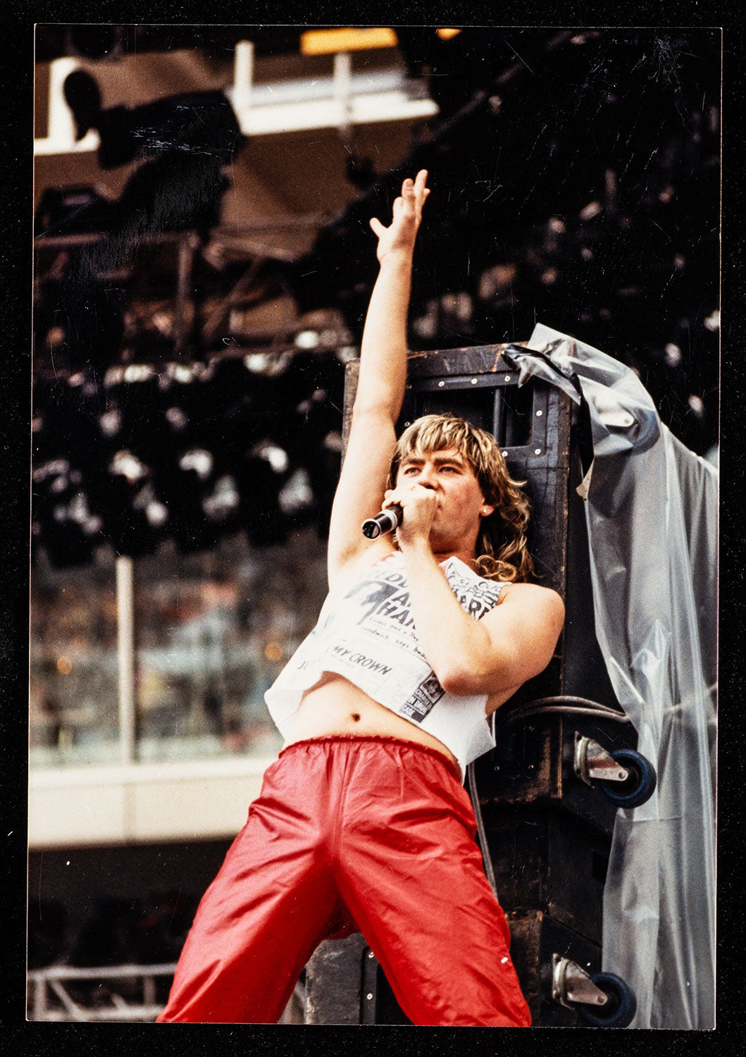 Joe performs during the band's triumphant Monsters of Rock performance at Castle Donington, 16 August 1986. Photo: Ross Halfin. From the Collection of Joe Elliott.