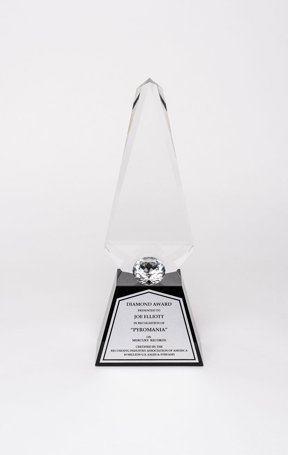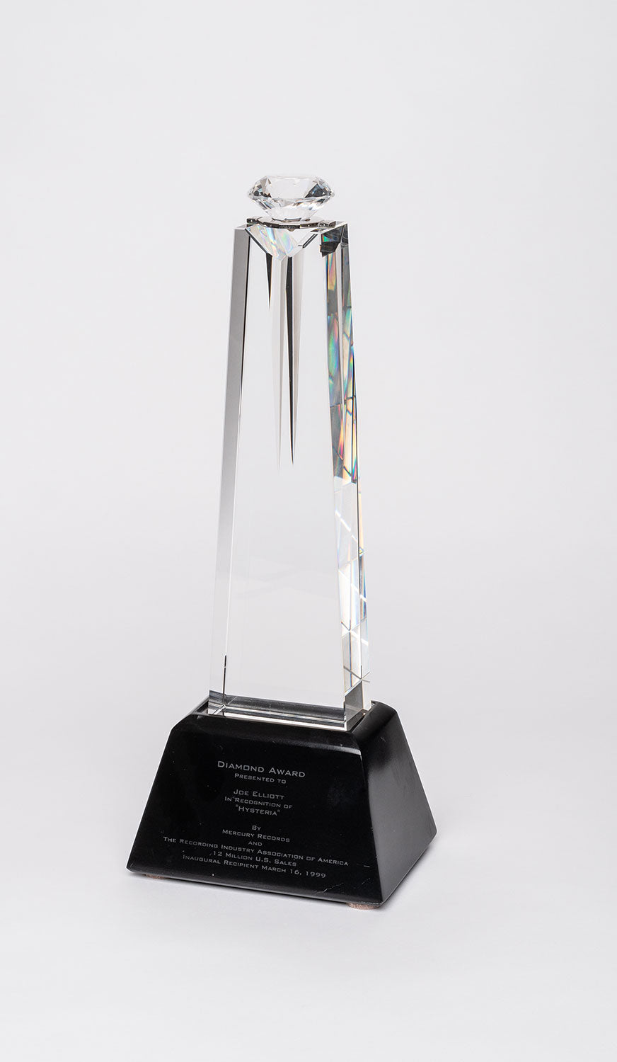 RIAA Diamond Award presented to Joe Elliott in March 1999 (the year the Diamond Award was created), to commemorate Hysteria reaching ten million albums sold in the US. From the Collection of Joe Elliott.