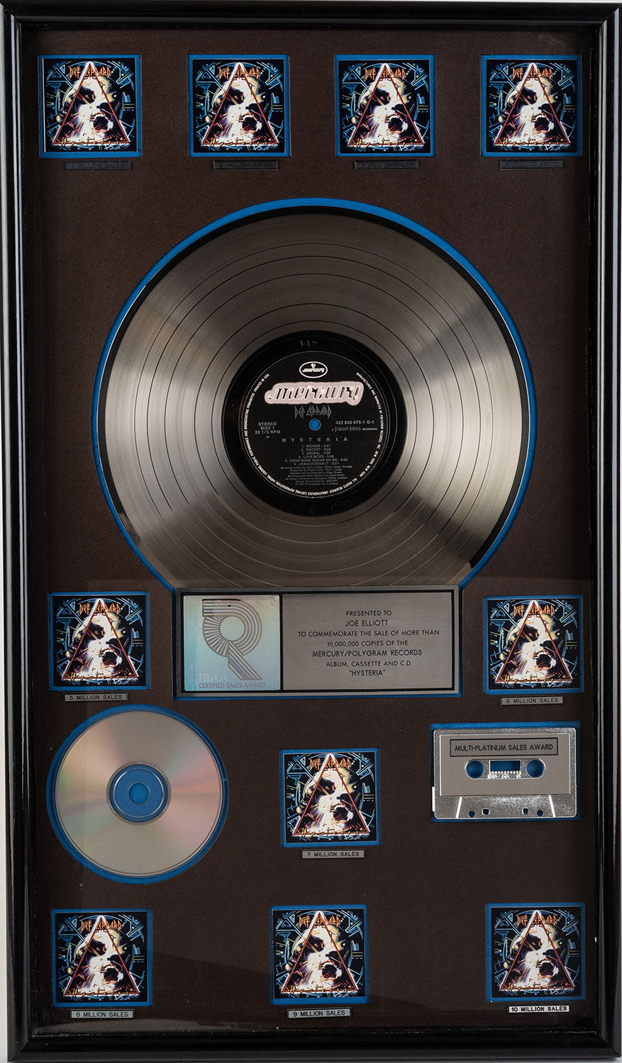 RIAA plaque presented to Joe Elliott in May 1990, to commemorate Hysteria selling ten million albums in the US. From the Collection of Joe Elliott.