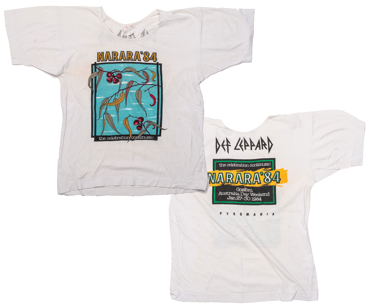 Joe's personal t-shirt from the 1984 Narara Festival, just outside of Sydney. The band performed in the pouring rain for about 30,000 fans. From the Collection of Joe Elliott.