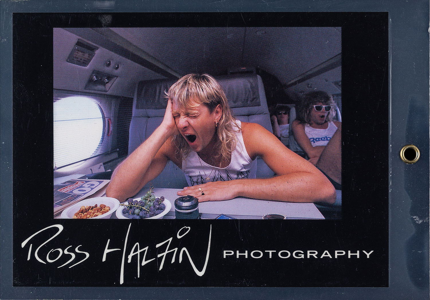 Ross Halfin event laminate featuring an image of yawning Joe and a likewise yawning Sav inside the Hystouria +1 plane, circa 1987. Photo: Ross Halfin. From the Collection of Joe Elliott.