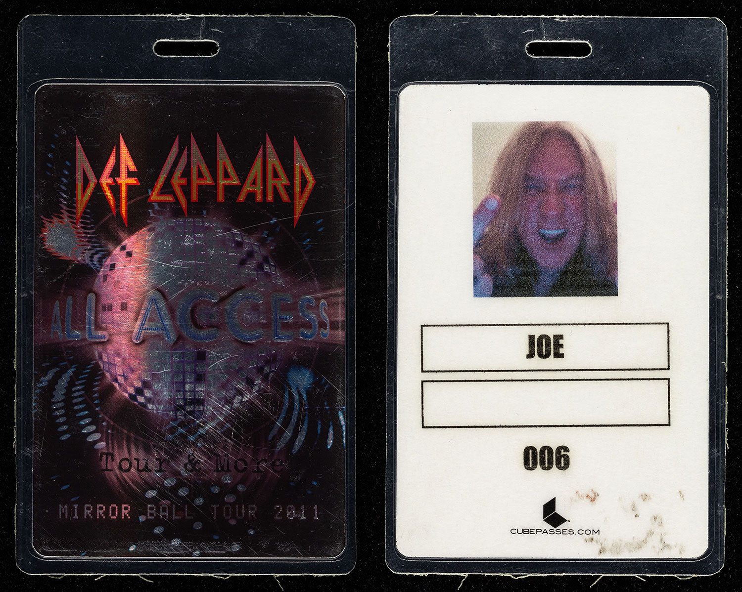 Joe’s personal Mirror Ball Tour laminate, 2011. This world tour ran from 7 June through 14 December 2011, and covered Ireland, the UK, United States, Japan, Australia, and Canada. From the Collection of Joe Elliott.
