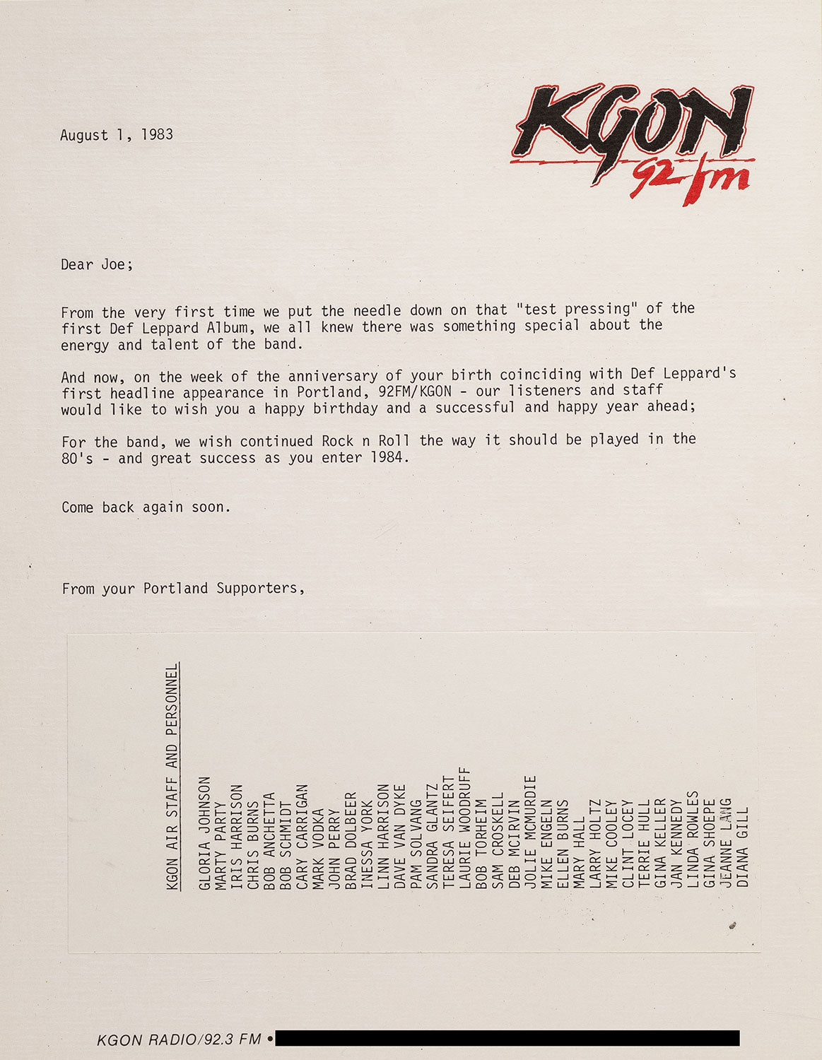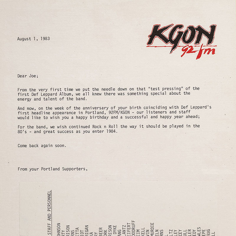 Correspondence dated 1 August 1983, from Portland, Oregon radio station KGON to Joe, celebrating both his birthday and Def Leppard's success. From the Collection of Joe Elliott.