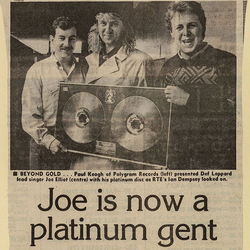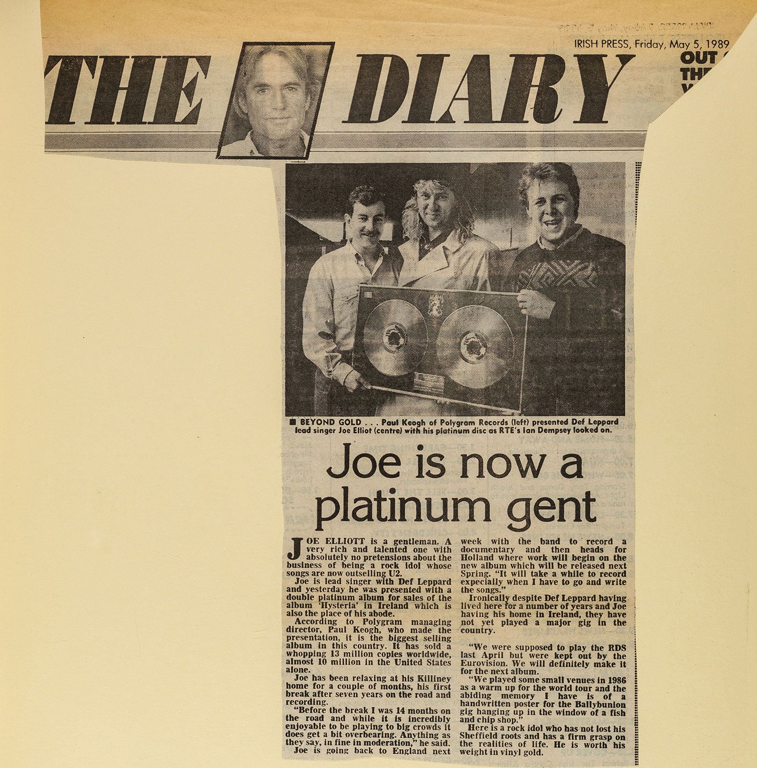 Newspaper clipping from the Irish Times dated 5 May 1989, featuring the story of Joe accepting an RIAA double platinum award for Hysteria. From the Collection of Joe Elliott.
