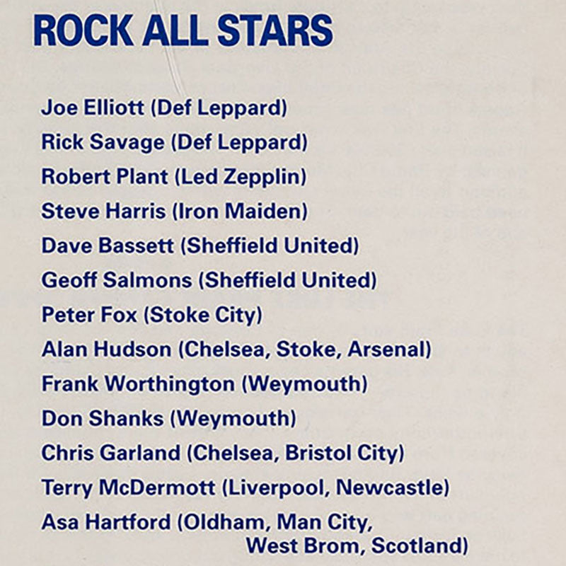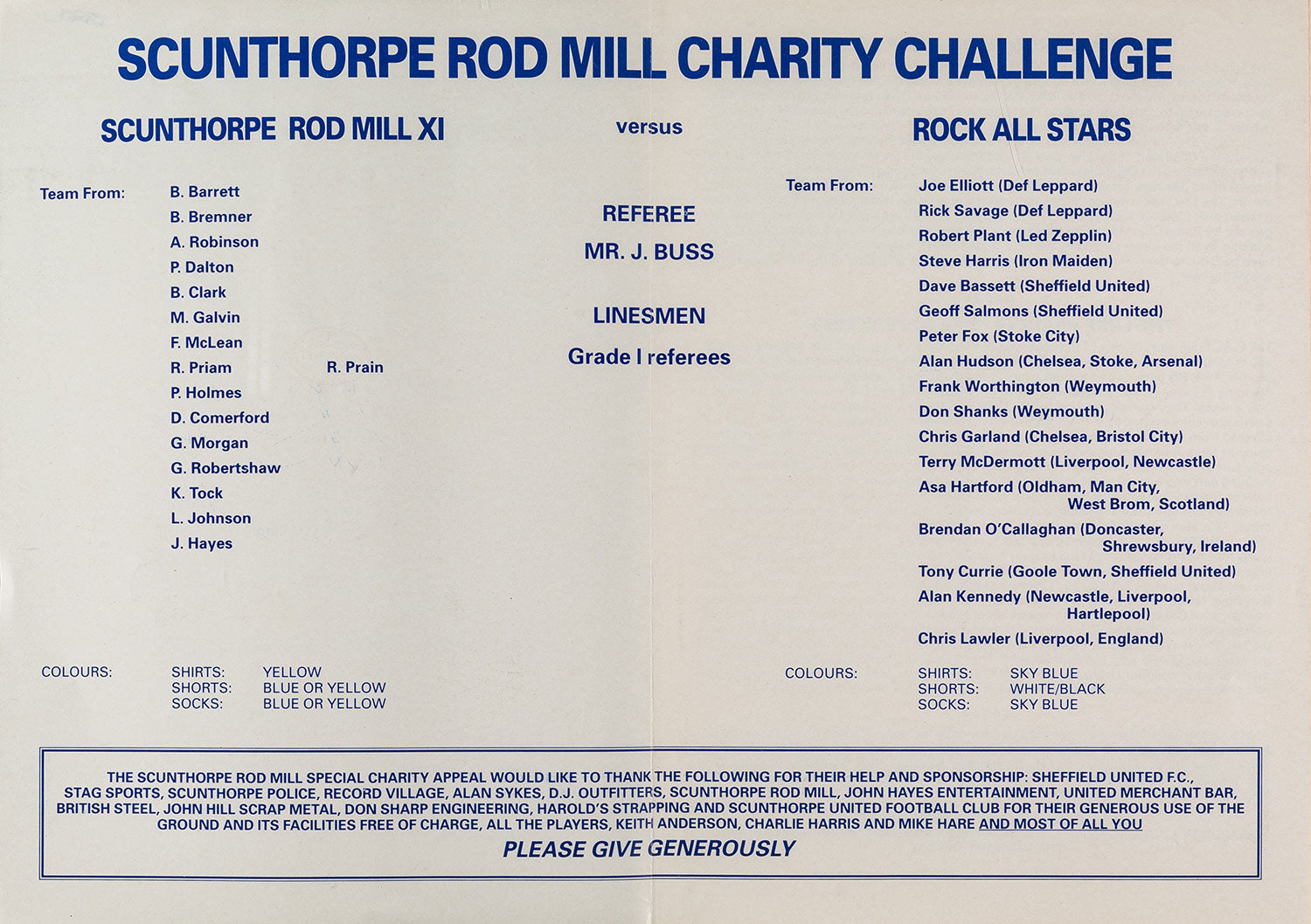 This page from the Scunthorpe Rod Mill Charity Challenge soccer match program lists the day's participants. Rock stars joined with professional footballers to battle employees from the steel factory, 8 October 1989. Representing the rockers, Joe and Sav played alongside Robert Plant (Led Zeppelin) and Steve Harris (Iron Maiden). From the Collection of Joe Elliott.