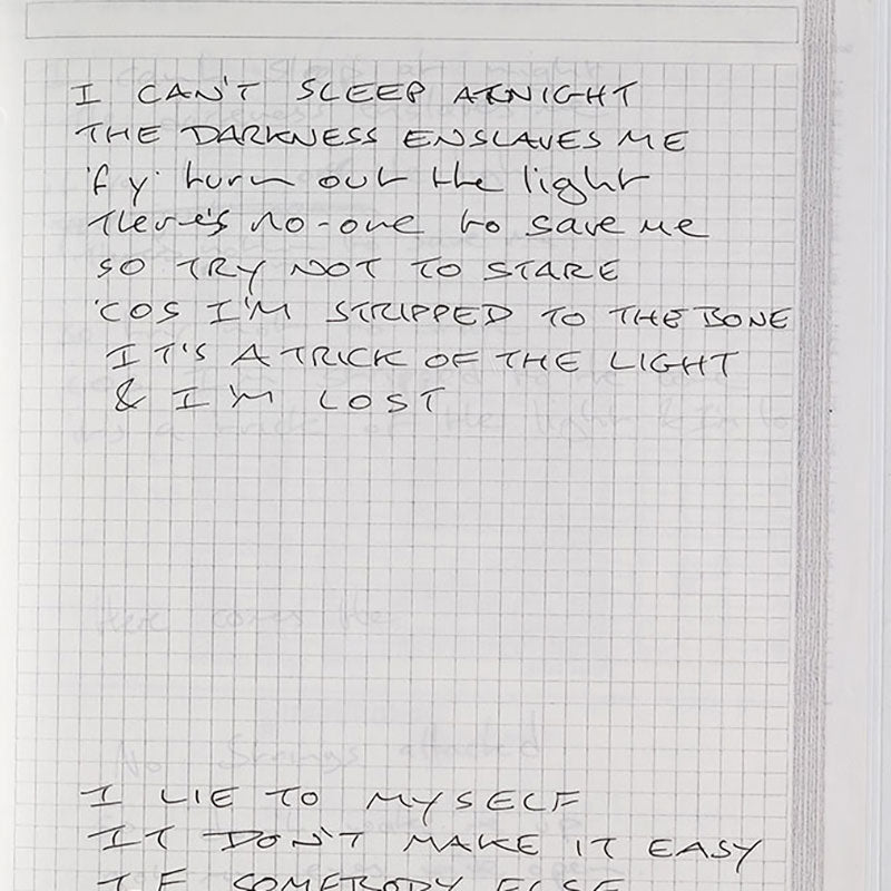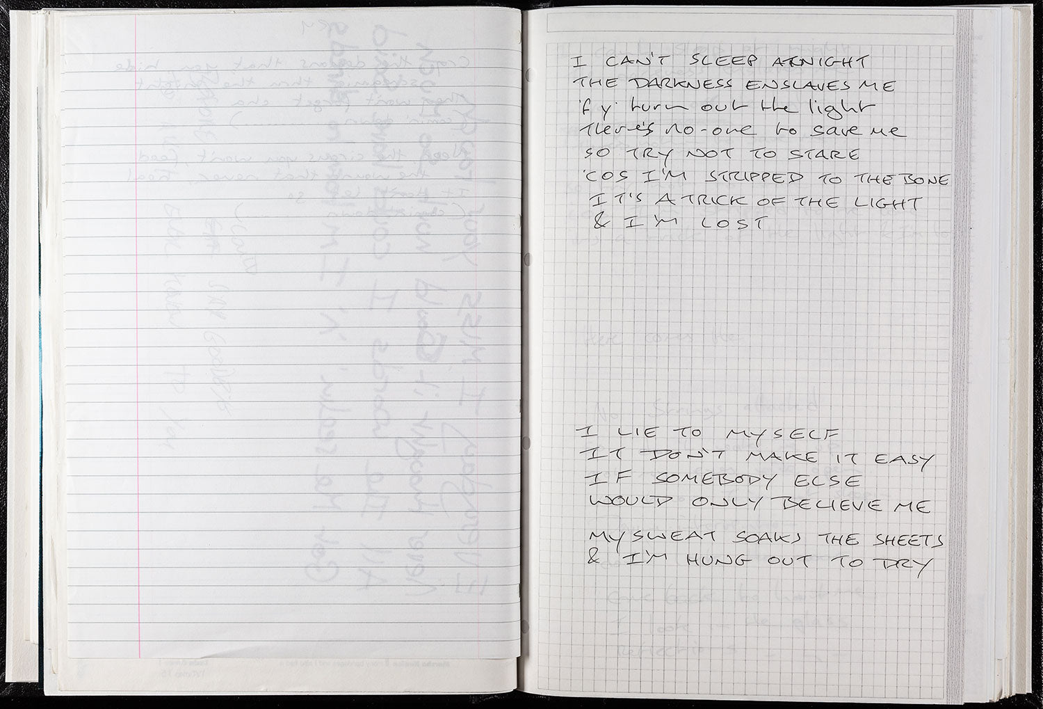 Handwritten lyrics-in-progress by Joe for "Gravity", found inside of his personal notebook. These lyrics contain some slight variations from the recorded version on X. From the Collection of Joe Elliott.
