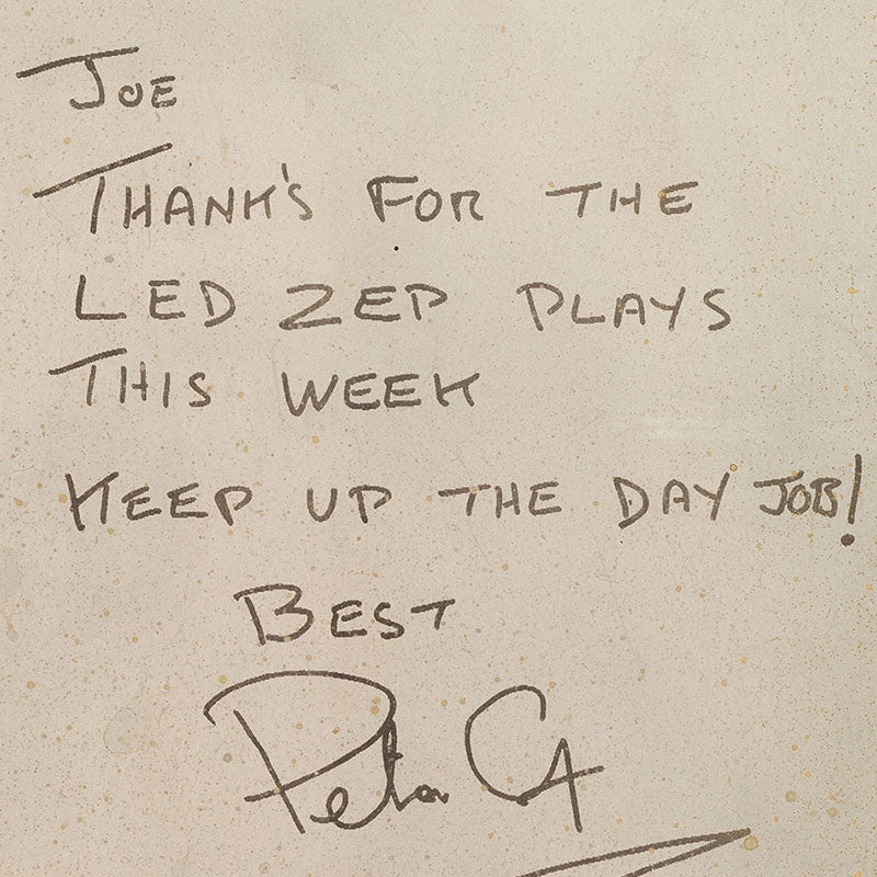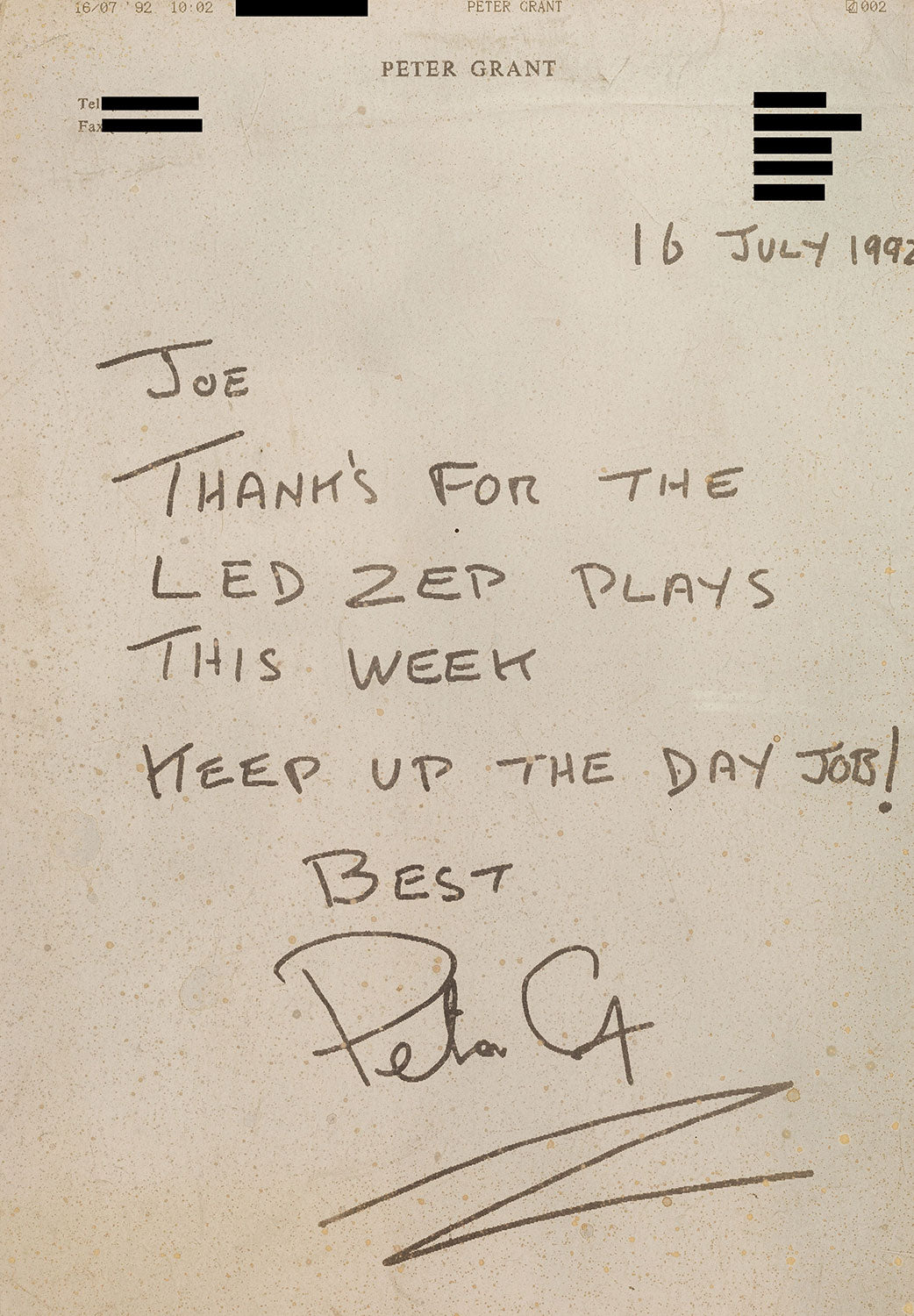 Faxed correspondence, dated 16 July 1992, from Led Zeppelin manager Peter Grant complimenting Joe on his performance as a week-long guest deejay for BBC Radio 1. From the Collection of Joe Elliott.