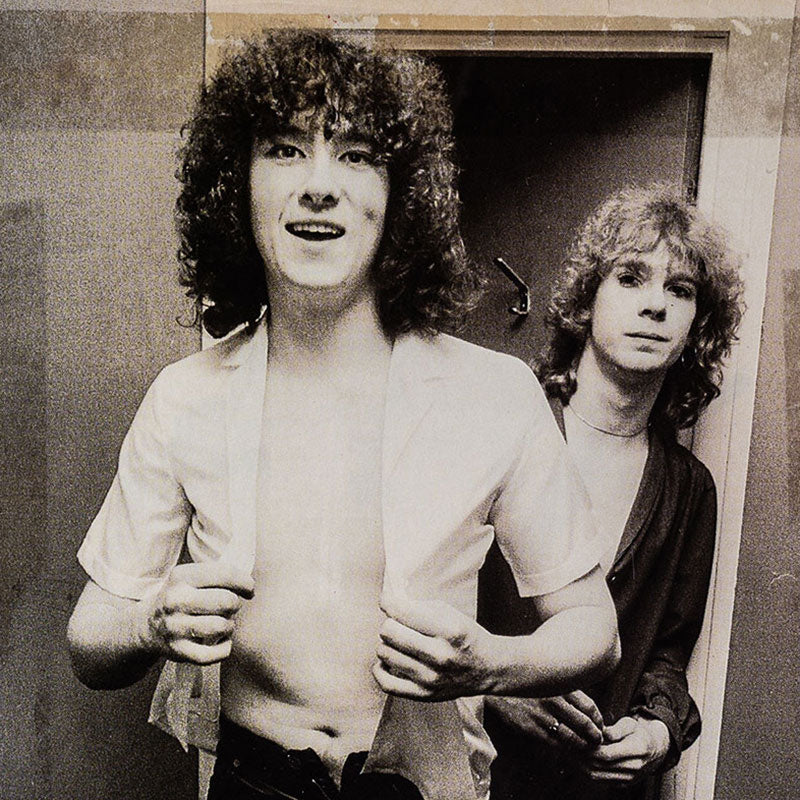 Early promotional photo of Steve and Joe with guitars, circa 1981. From the Collection of Joe Elliott.