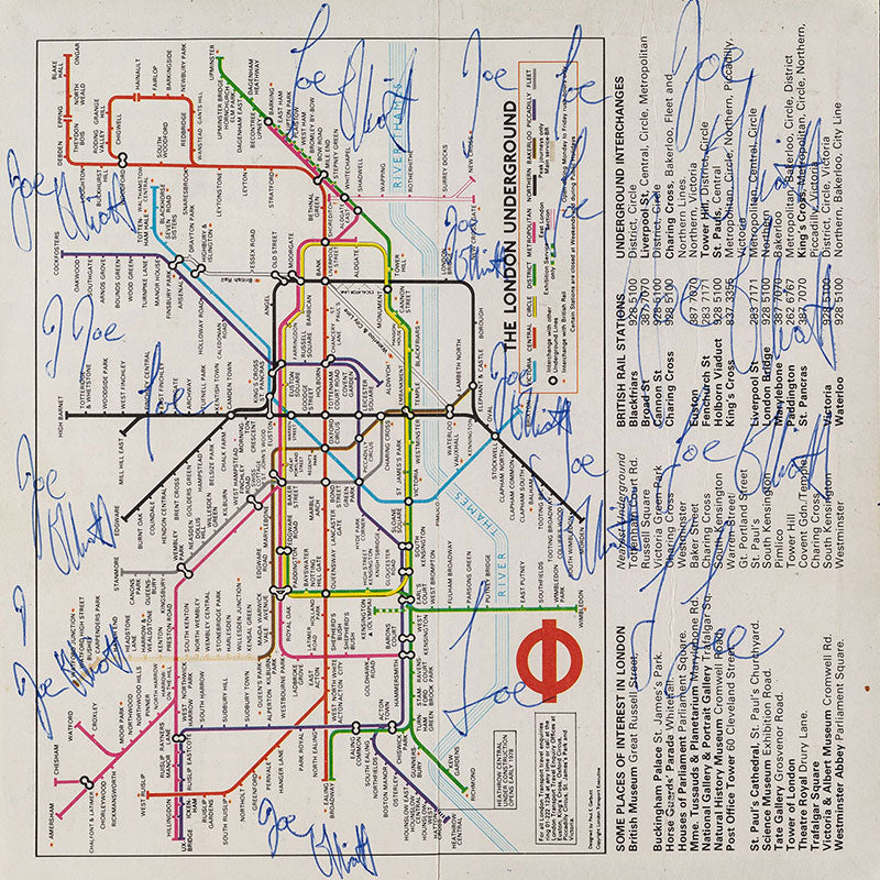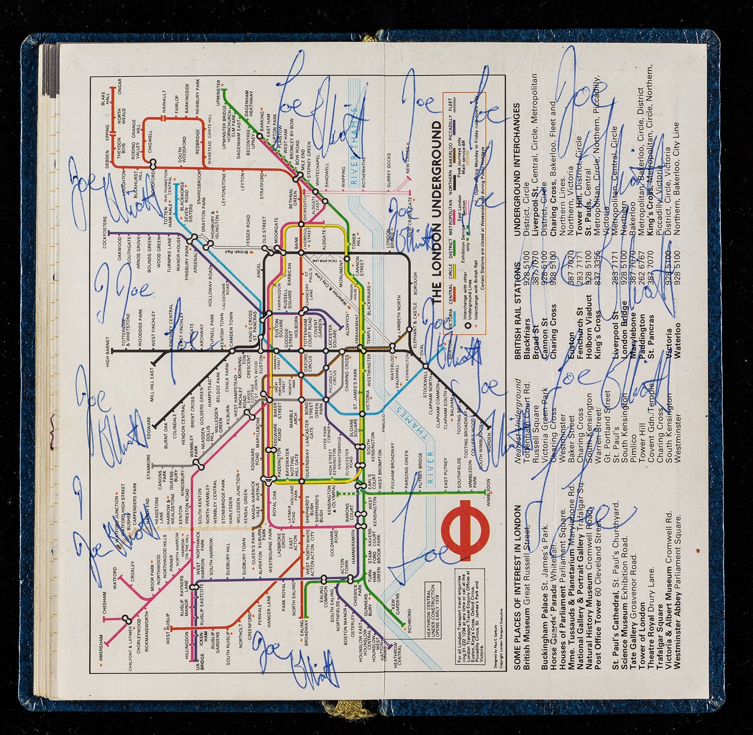 Joe practices his autograph on a map of the London Underground, found on the last page of his diary, 1979. From the Collection of Joe Elliott.