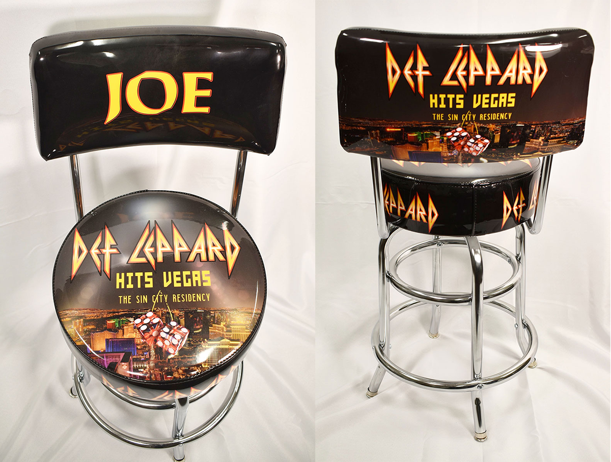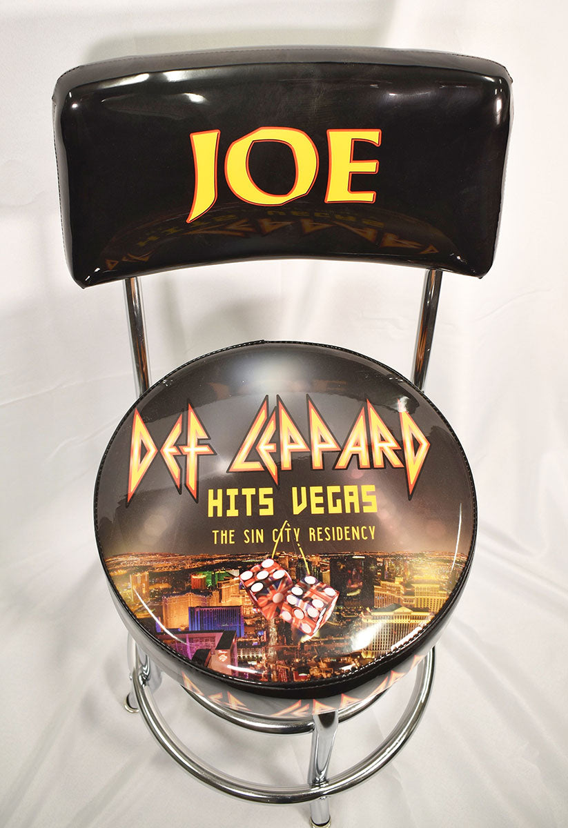 Joe Elliott's very own personalized Def Leppard seat back bar stool with chrome legs. This bar stool was used on-stage during the Def Leppard Hits Vegas: The Sin City Residency at Planet Hollywood in Las Vegas, Nevada, 2019. Joe said the searing 12-night residency "was an absolute blast," that he enjoyed so much, he found himself rather emotional over the final performance. He hopes one day to return to Vegas for another go. From the collection of Def Leppard.