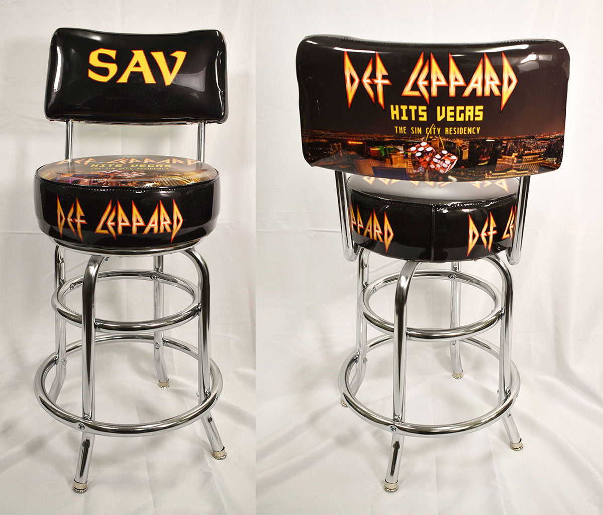 Rick Savage's very own personalized Def Leppard seat back bar stool with chrome legs. This bar stool was used on-stage during the Def Leppard Hits Vegas: The Sin City Residency at Planet Hollywood in Las Vegas, Nevada, 2019. Of the incredible 12-night residency, Sav joked, "we've got away with it!?” He added how much he especially loved the final show, “We've learned a lot of things along the way, and again we progress forward." From the collection of Def Leppard.
