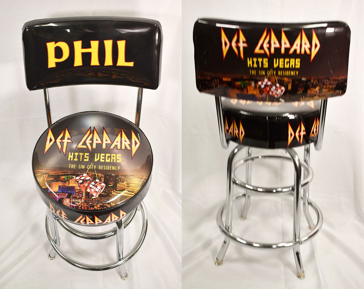 Rick Allen's very own personalized Def Leppard seat back bar stool with chrome legs. This bar stool was used on-stage during the Def Leppard Hits Vegas: The Sin City Residency at Planet Hollywood in Las Vegas, Nevada, 2019. Of the endurance-busting 12-night residency, Rick opined "When I was at school, I was a marathon runner, and doing shows like this, long shows, I tapped into that," he said. "It was good for my technique." From the collection of Def Leppard.