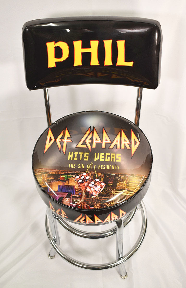 Phil Collen's very own personalized Def Leppard seat back bar stool with chrome legs. This bar stool was used on-stage during the Def Leppard Hits Vegas: The Sin City Residency at Planet Hollywood in Las Vegas, Nevada, 2019. Phil said of the scorching 12-night residency, "It was fantastic - we'd do this again. We actually loved it. It's great doing something that's different to what you normally do after 40 years. I think this was the best we've ever been." From the collection of Def Leppard.