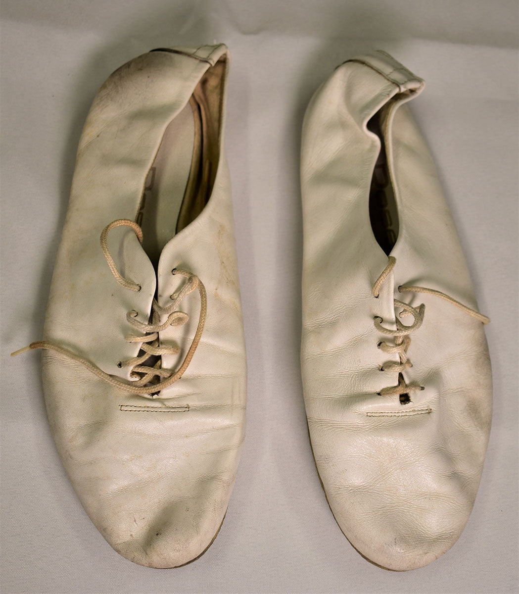 Pair of white leather dance shoes from Ray Rose in size 8, with matching laces. Well-worn with the remnants of live shows still in their soles (and souls). From the Joe Elliott collection.