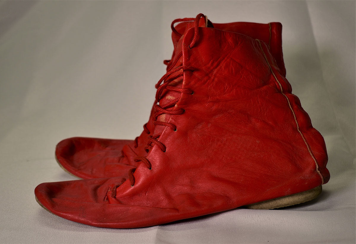 Well-worn pair of red leather high top boots with matching red laces. Worn 1980/81. From the Joe Elliott collection.