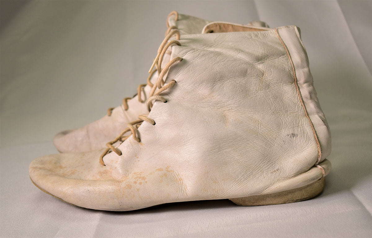White leather hightop lace-up boots by English dance shoe designer Ray Rose. Well-worn with scuffs and minor cracks in the leather, but in good condition. Worn in 1980/81. From the collection of Joe Elliott.