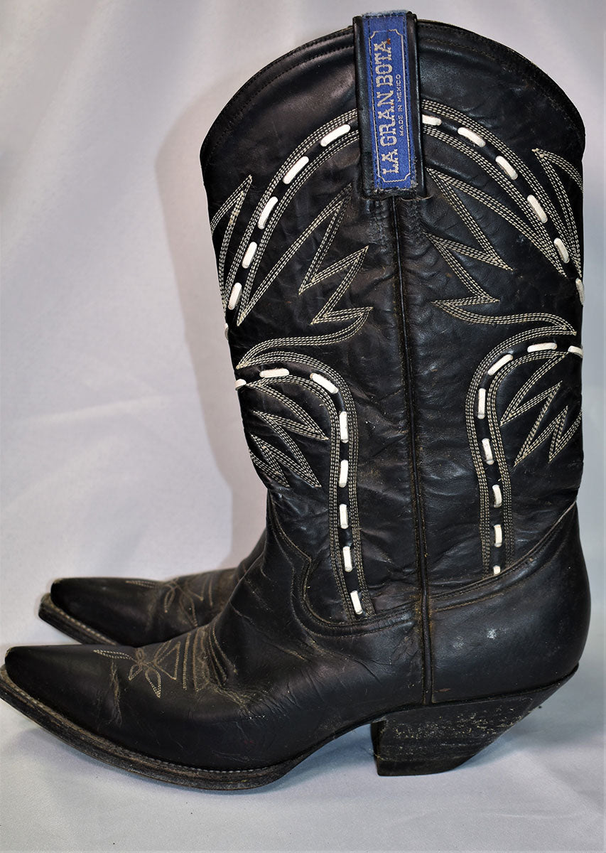 Joe Elliott has fine taste in vintage boots! These La Gran Bota western boots were handmade in Mexico and feature white leather accents with an embroidered leaf design. They appear well worn so it's likely these boots probably have some tales to tell. Worn in 1987. From the Joe Elliott collection.