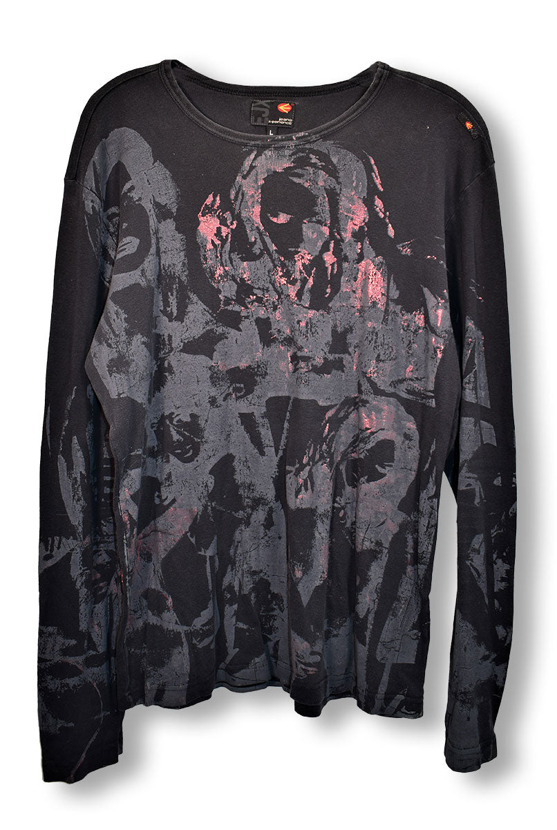 Black, long-sleeve shirt featuring greyed-out images of women with a reddish bleached look on the front and down the sleeves. Energie Jeans X-perience. Worn in 2005. From the Joe Elliott collection.