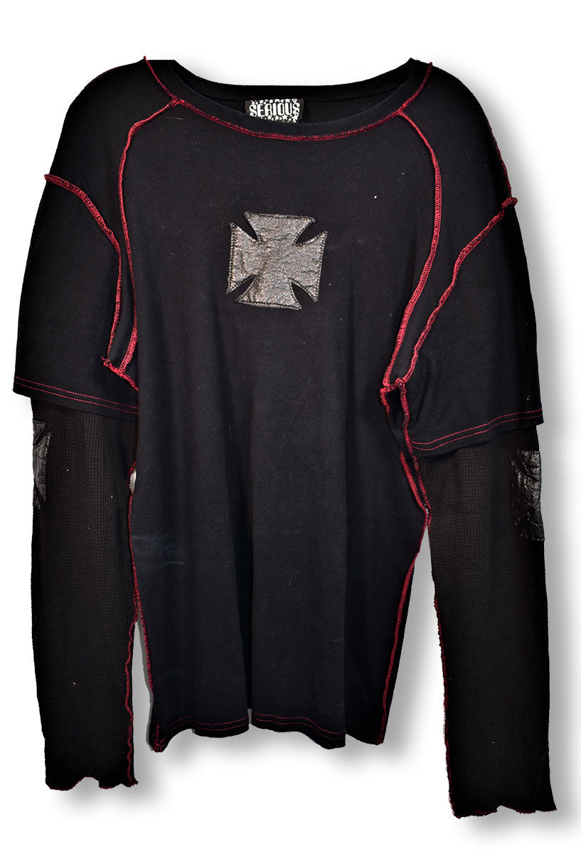 Black t-shirt from the Serious brand in XXL featuring sewn-on long sleeves, red accent stitching, and leather iron crosses sewn to the front and elbows. Worn in 2005. From the Joe Elliott collection.