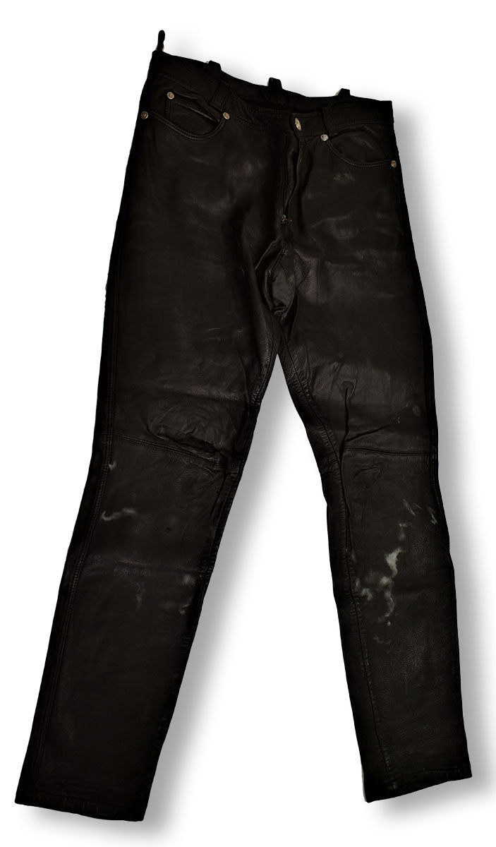 A well-worn pair of Gianni Versace black leather pants featuring rusted buttons and loop buttons, and for added character, a tear on the knee. From the Joe Elliott collection.